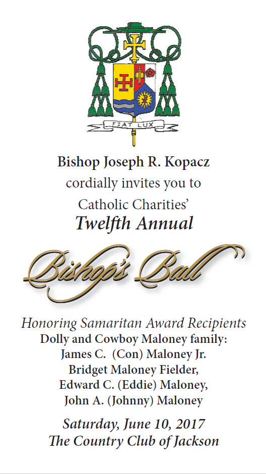 Catholic Charities has started selling tickets to this year’s Bishop’s Ball, a premire fundraising event set for Saturday, June 10, at the Jackson Country Club. In addition to dinner, a silent and live auction and dancing will keep the evening lively. During dinner, Bishop Joseph Kopacz will present the Good Samaritan Award to the Maloney siblings, a family whose support of the church spans several generations.