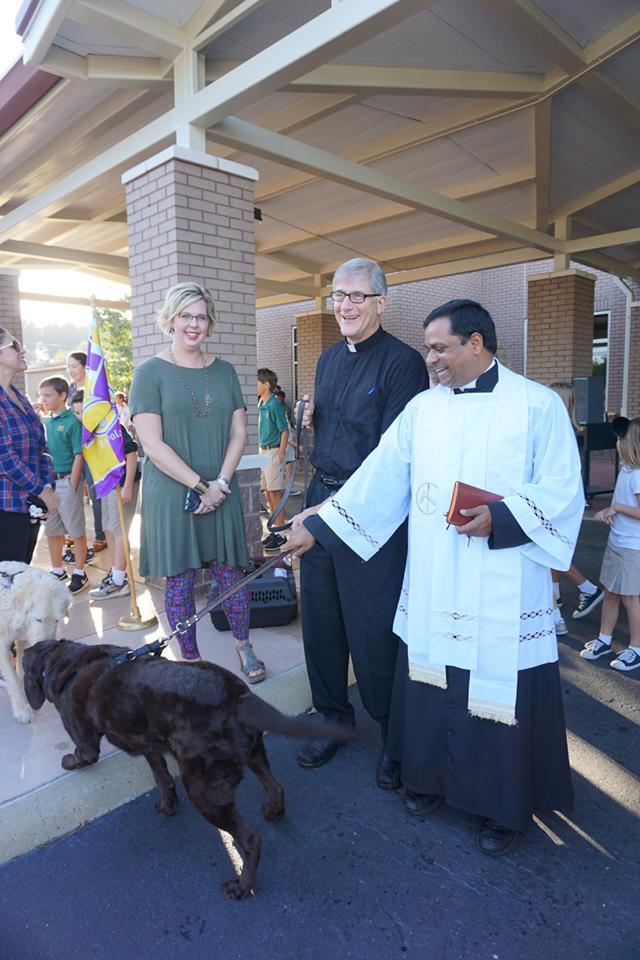 MADISON – Father Albeen Vatti, pastor of St. Francis Parish, blesses Landon Lipovetsky’s lizard at St. Anthony School on Friday, Oct. 6. The school was celebrating the feast of St. Francis. In right photo, Bishop Joseph Kopacz brought his beloved lab, Amigo, for a blessing. (Photos by Kristian Beatty)