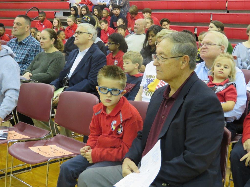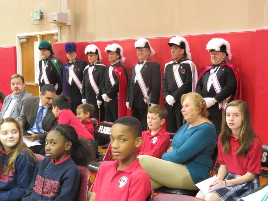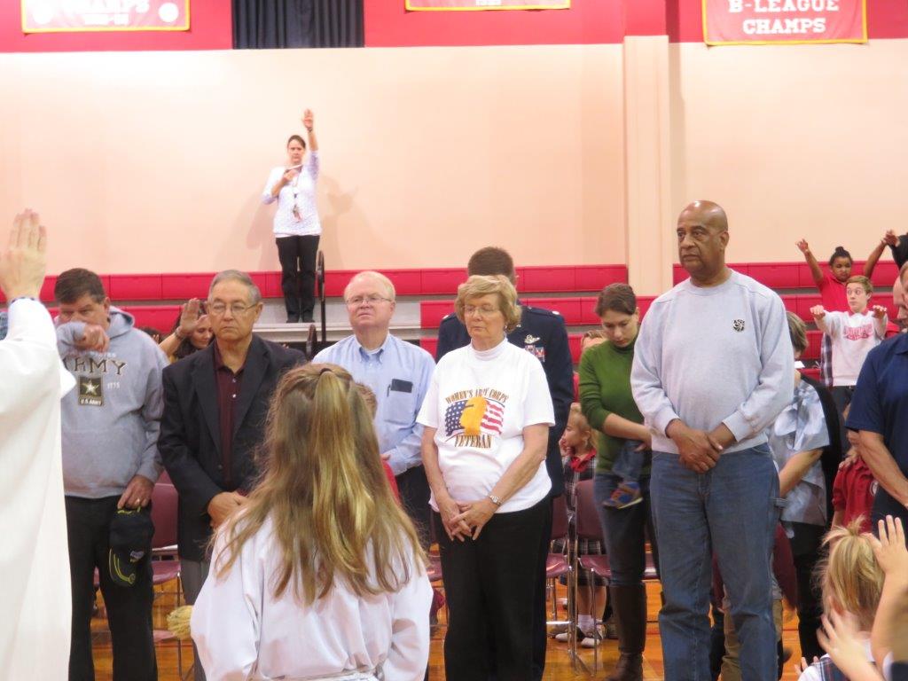 SOUTHAVEN – Students and teachers hold their hands up in blessing over veterans during the school’s Veteran’s Day Mass. Father Greg Schill, SCJ, a veteran himself, celebrated the Mass. (Photo by Sister Margaret Sue Brooker)