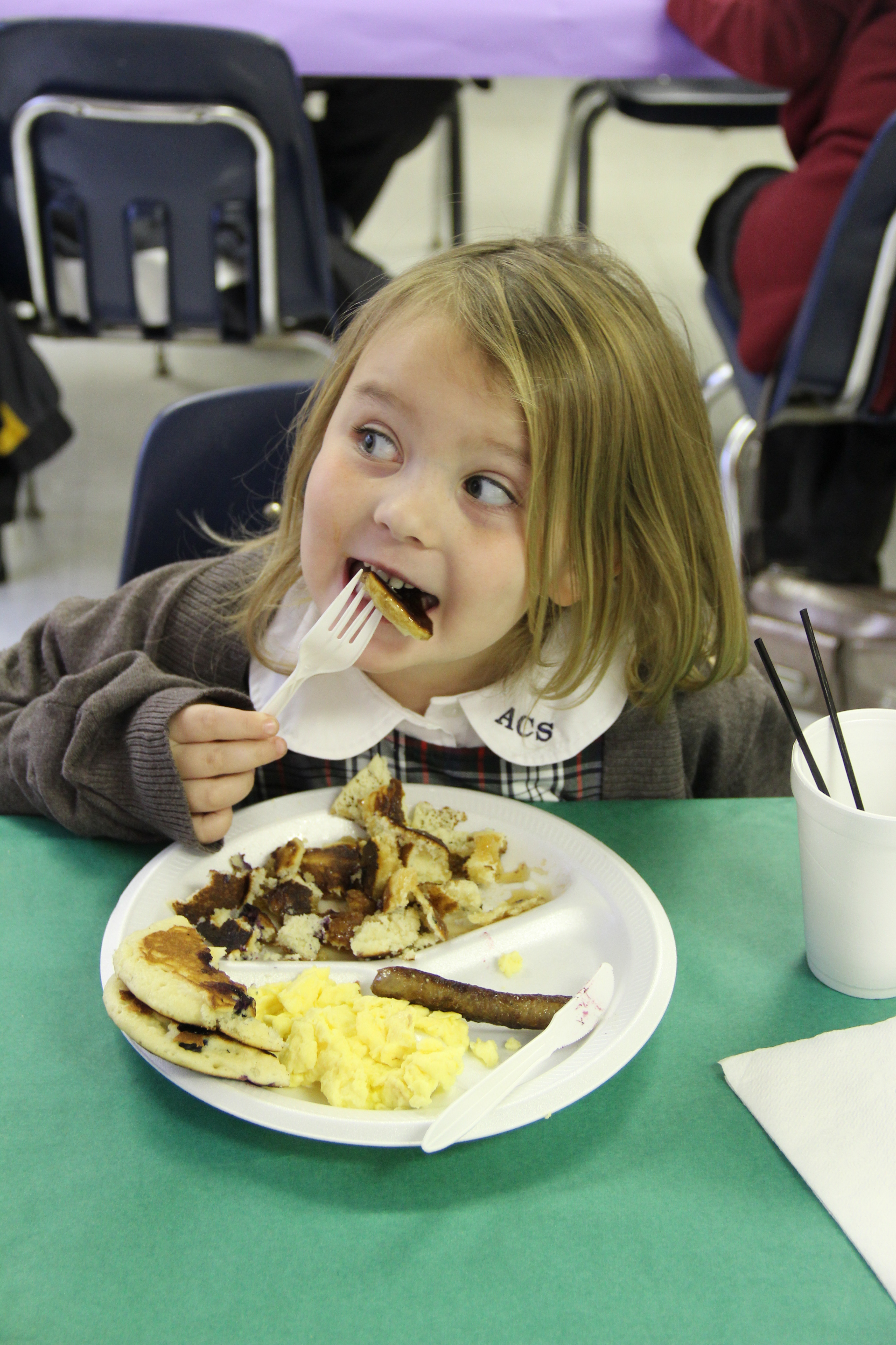 Prek student, Lily Bradley enjoys some pancakes at the annual pancake breakfast at Annunciation Catholic Church held on In Our Parish Day, January 28th.