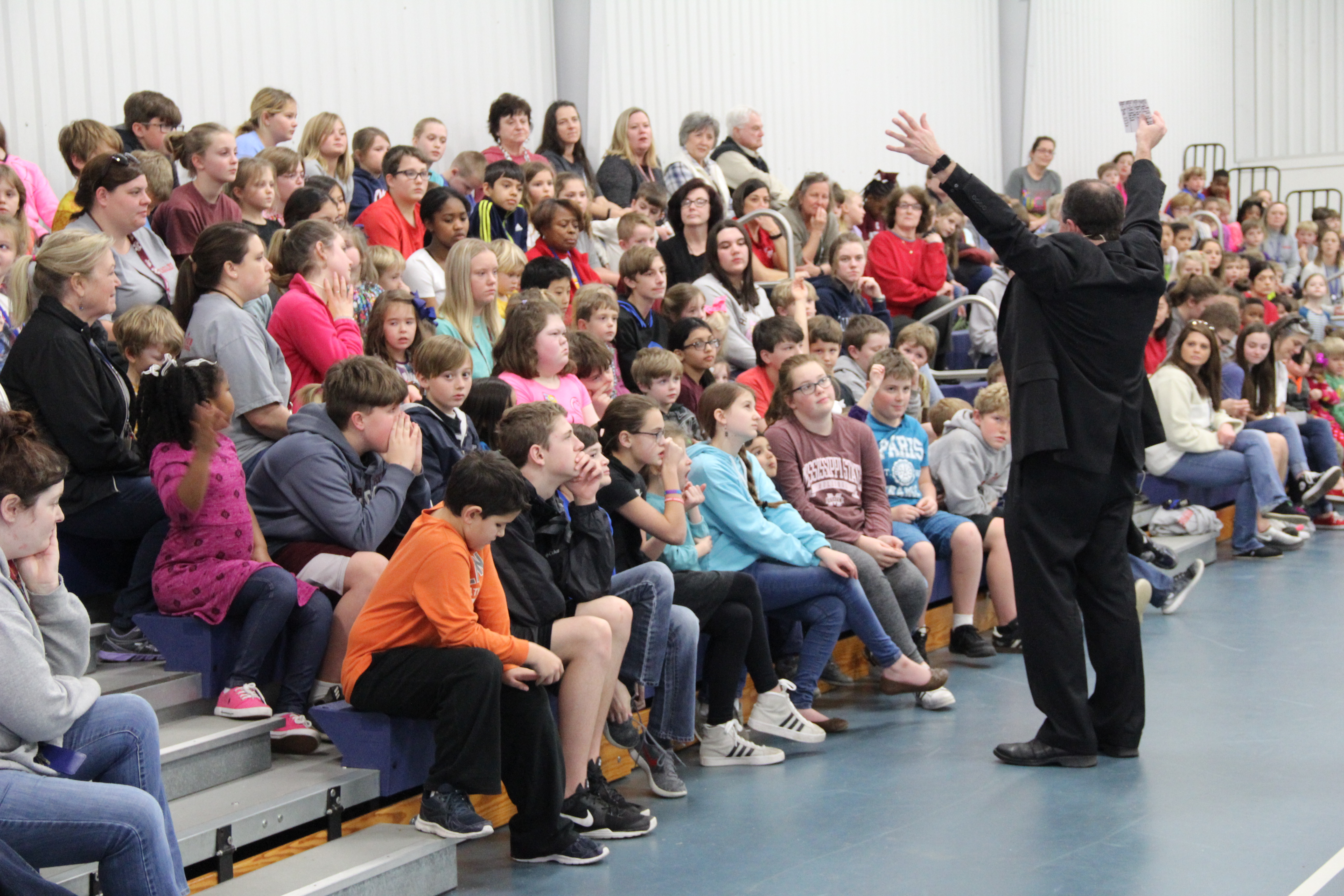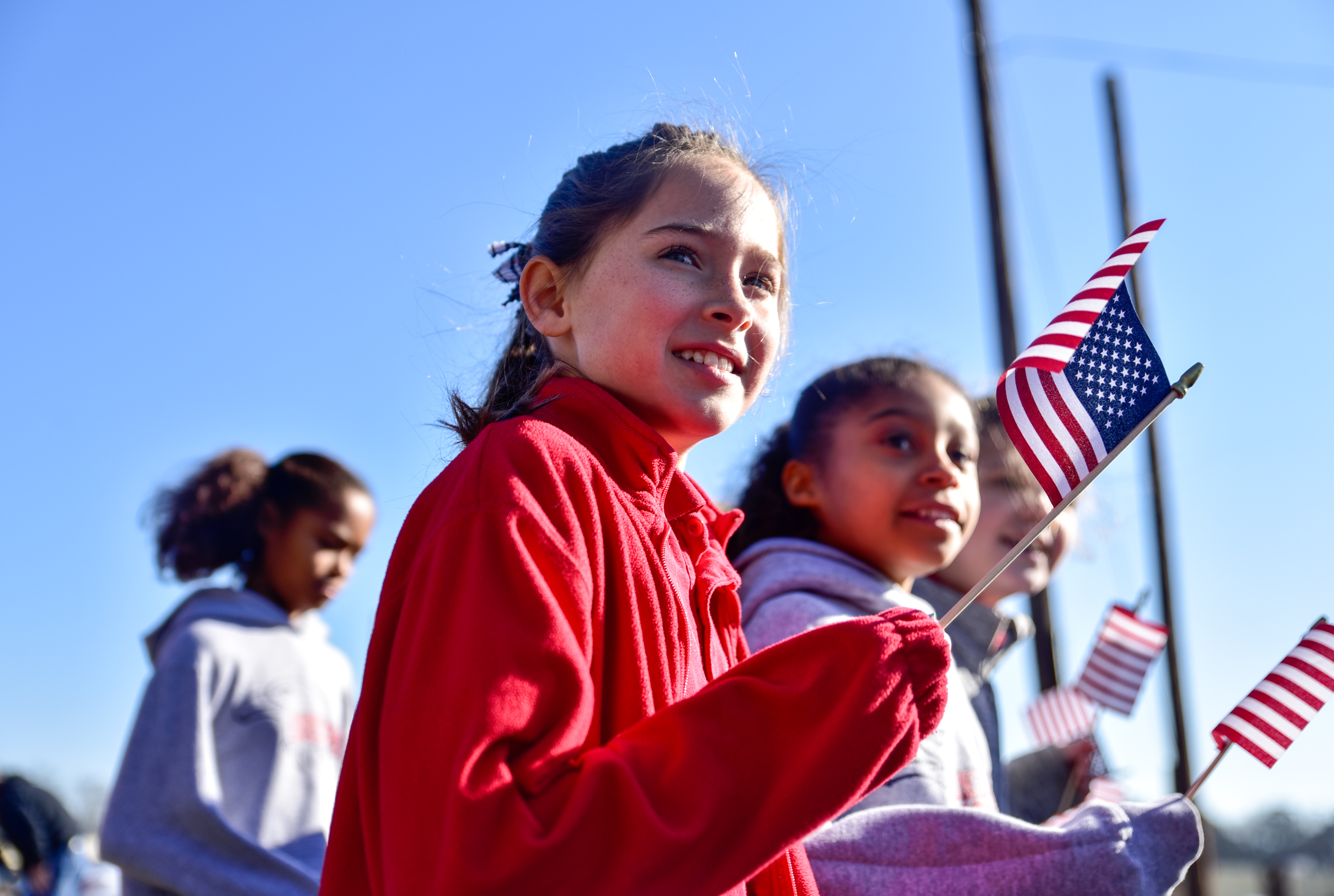 Roni Kate West 10 waves an Amercian flag with her friends and Annunciation Catholic School mates in their Our Nation Day parade to honor military during Catholic Schools Week Tuesday. The parade started at the school, and went down and around HWY 82 with members of the VFB on motorcycles, the ROTC from MSU, and CAFB fathers of some students who joined in their military uniforms. Roni Kate is the daughter of Brodie and Sara West of Columbus. (Luisa Porter/ Dispatch Staff)