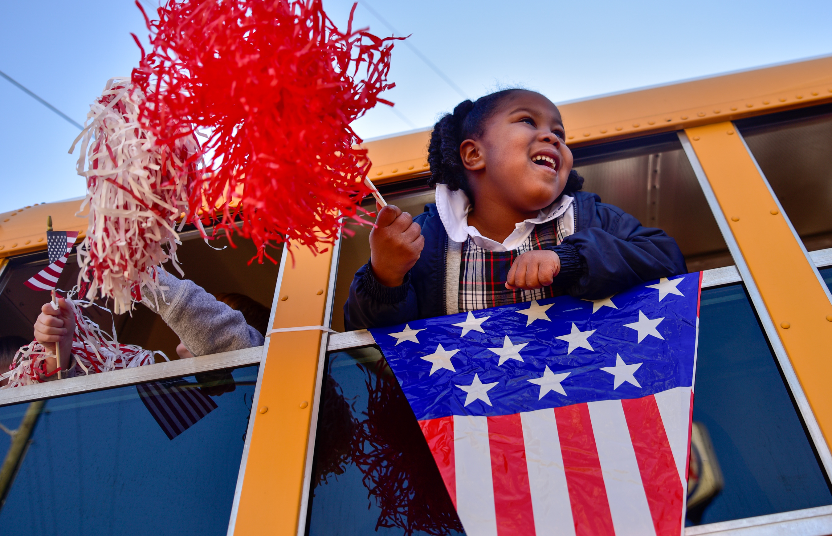 Sophia Williams 5 waves at people on the side of the HWY 82 out of a school bus window with her classmates during Annunciation Catholic School's Our Nation Day parade to honor military during Catholic Schools Week Tuesday. The parade started at the school, and went down and around HWY 82 with students, teachers, members of the VFB on motorcycles, the ROTC from MSU, and CAFB fathers of some students who joined in their military uniforms. Sophia is the daughter of Dr. Byron and Dr. Lakeisha Williams of Columbus. (Luisa Porter/ Dispatch Staff)