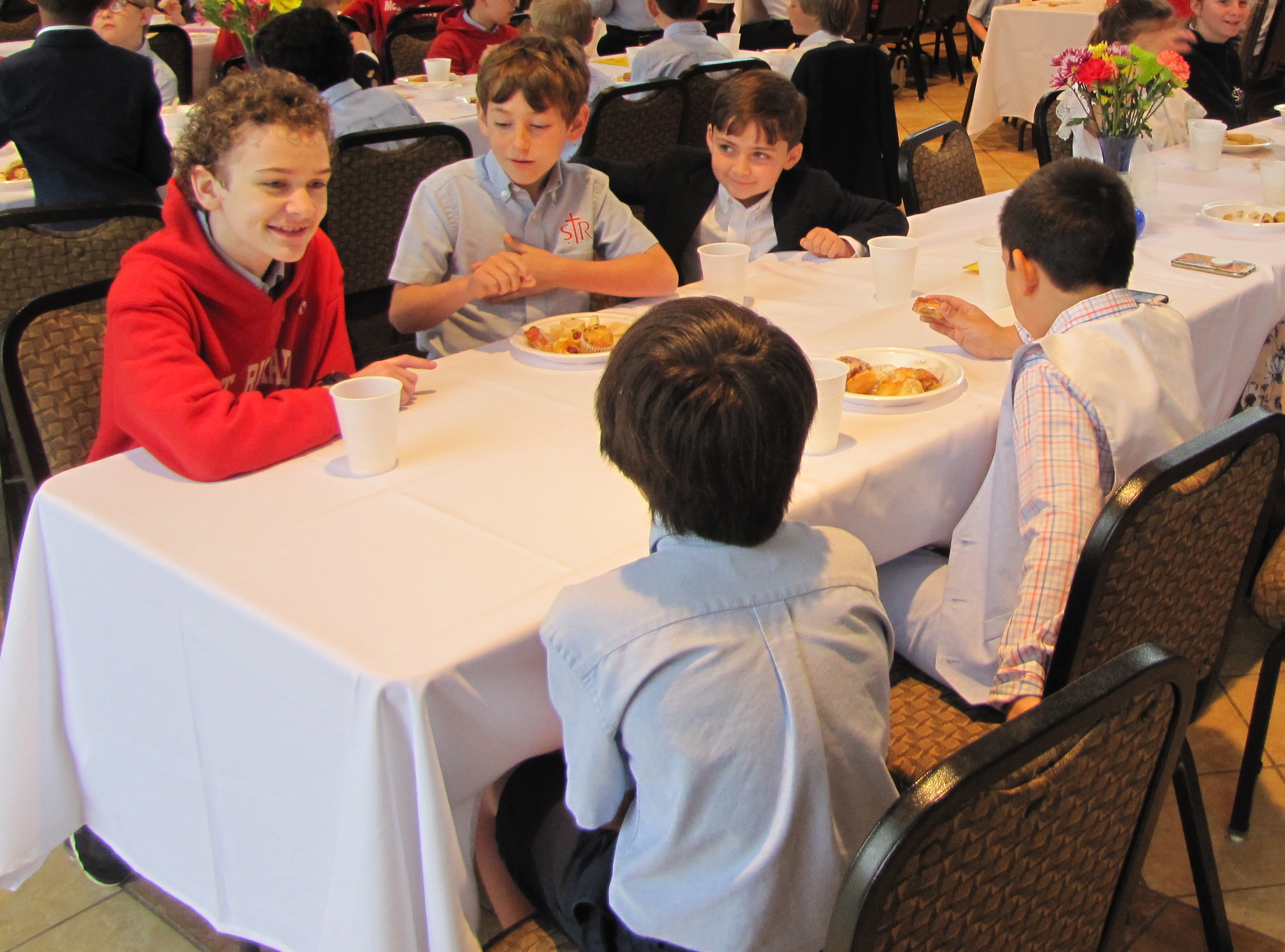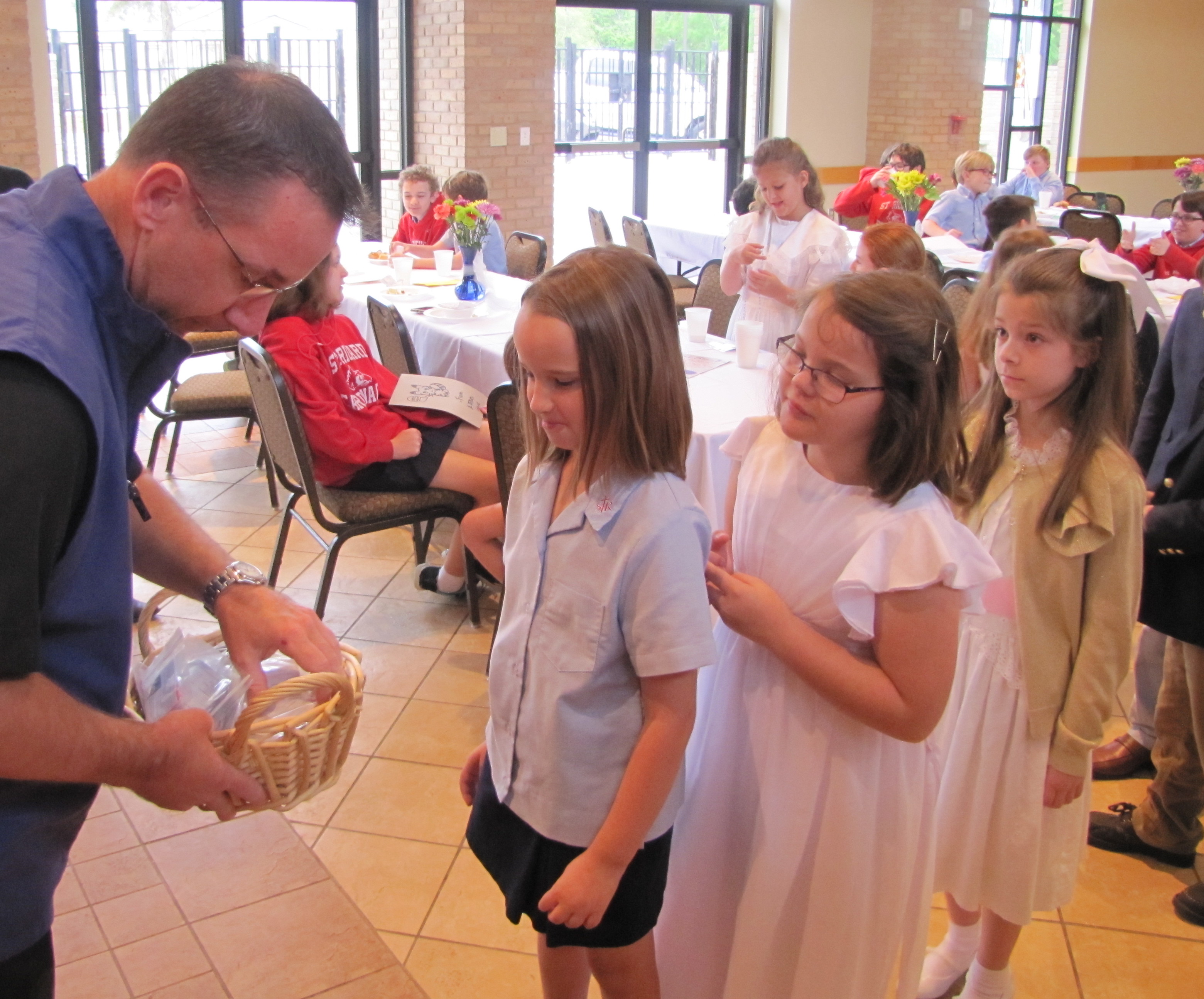 JACKSON – Second-graders at St. Richard School who received First Communion this year were honored at a school Mass. They got to wear their First Communion outfits and were treated to a reception after Mass. At left, Father John Bohn, pastor, hands out rosaries to Vinnie Milton, Jakob Sistrunk, Loftis Garner and George Decker. The Lunardini family had them blessed by the Pope on August 30 of this year and shared them with the school. (Photos by Wendi Shearer)
