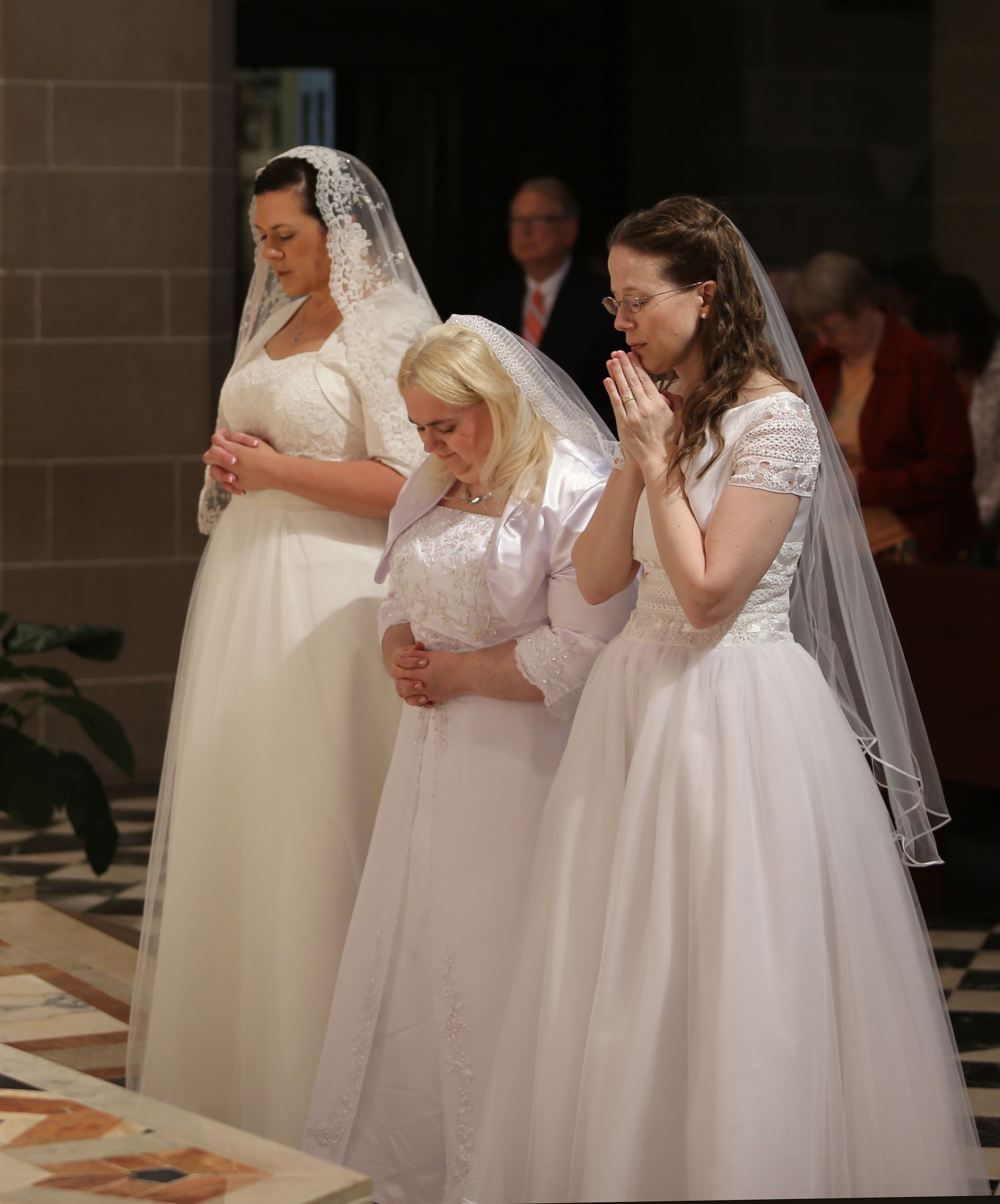 Karen Ervin, Theresa Jordan and Laurie Malashanko pause in prayer before the altar at Detroit's Cathedral of the Most Blessed Sacrament in 2017. They were consecrated into the Catholic Church's order of virgins. (CNS photo/Joel Breidenbach) See VATICAN-CONSECRATED-VIRGINS July 5, 2018.