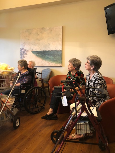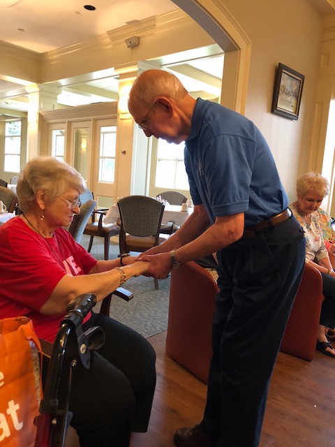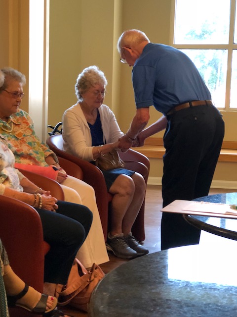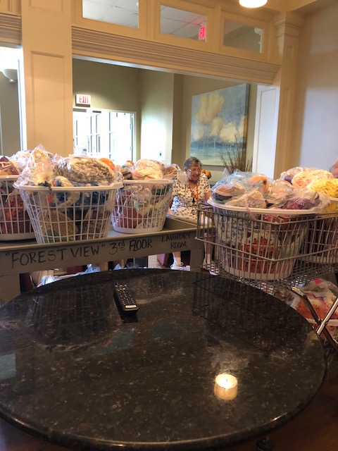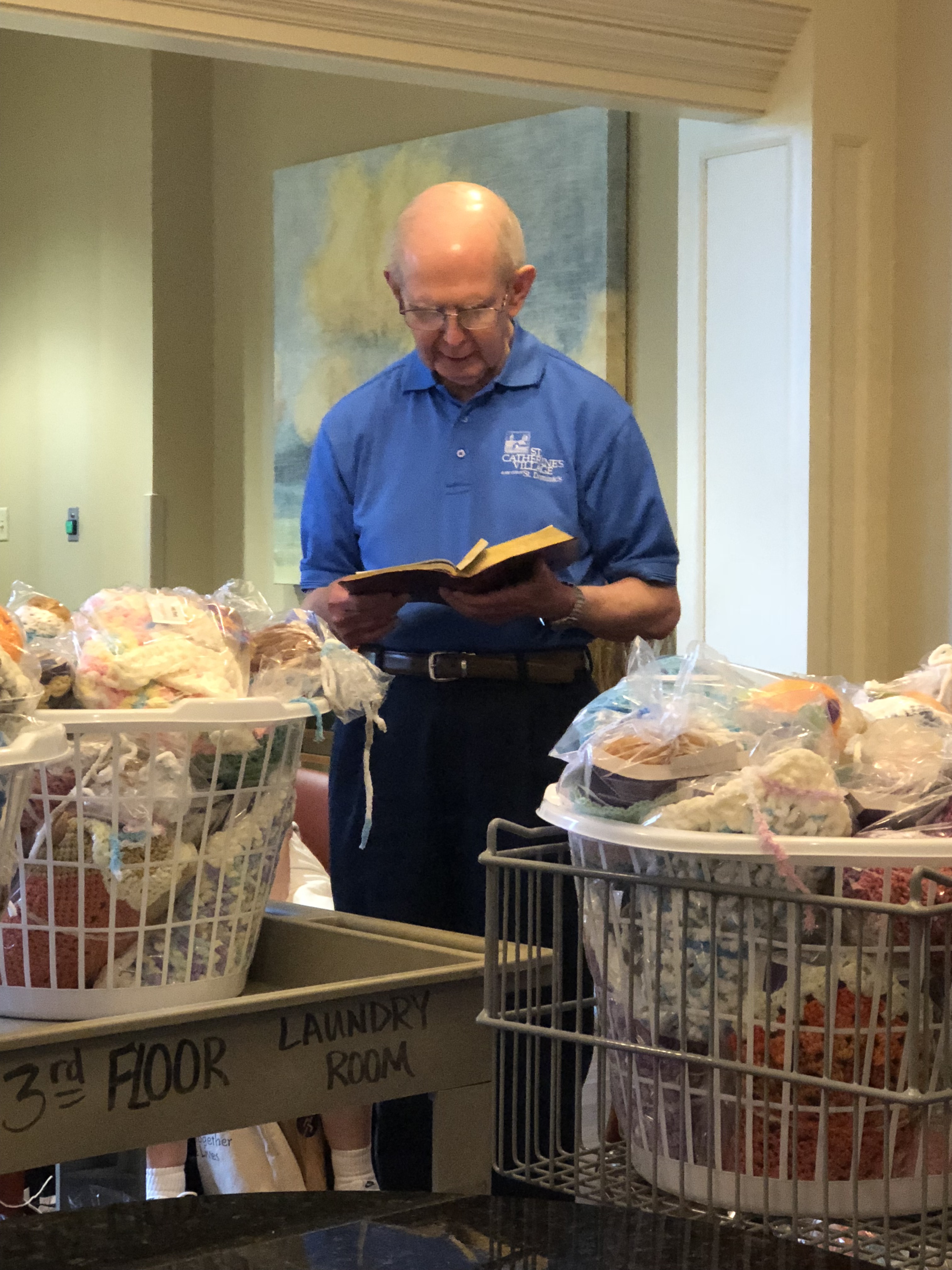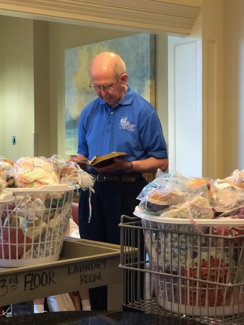 MADISON – Beginning in January of 2017, a small number of ladies at St. Catherine’s Village began crocheting blankets and placing stuffed animals and a Bible in them with a note, saying ‘Jesus Loves You.’ As they crochet, the ladies pray for the recipient of the gift. Father Frank Cosgrove blesses both the gifts and the ladies who make them. Kim Thomason of Catholic Charities, assists with distributing the packages. (Photos by Kim Thomason)