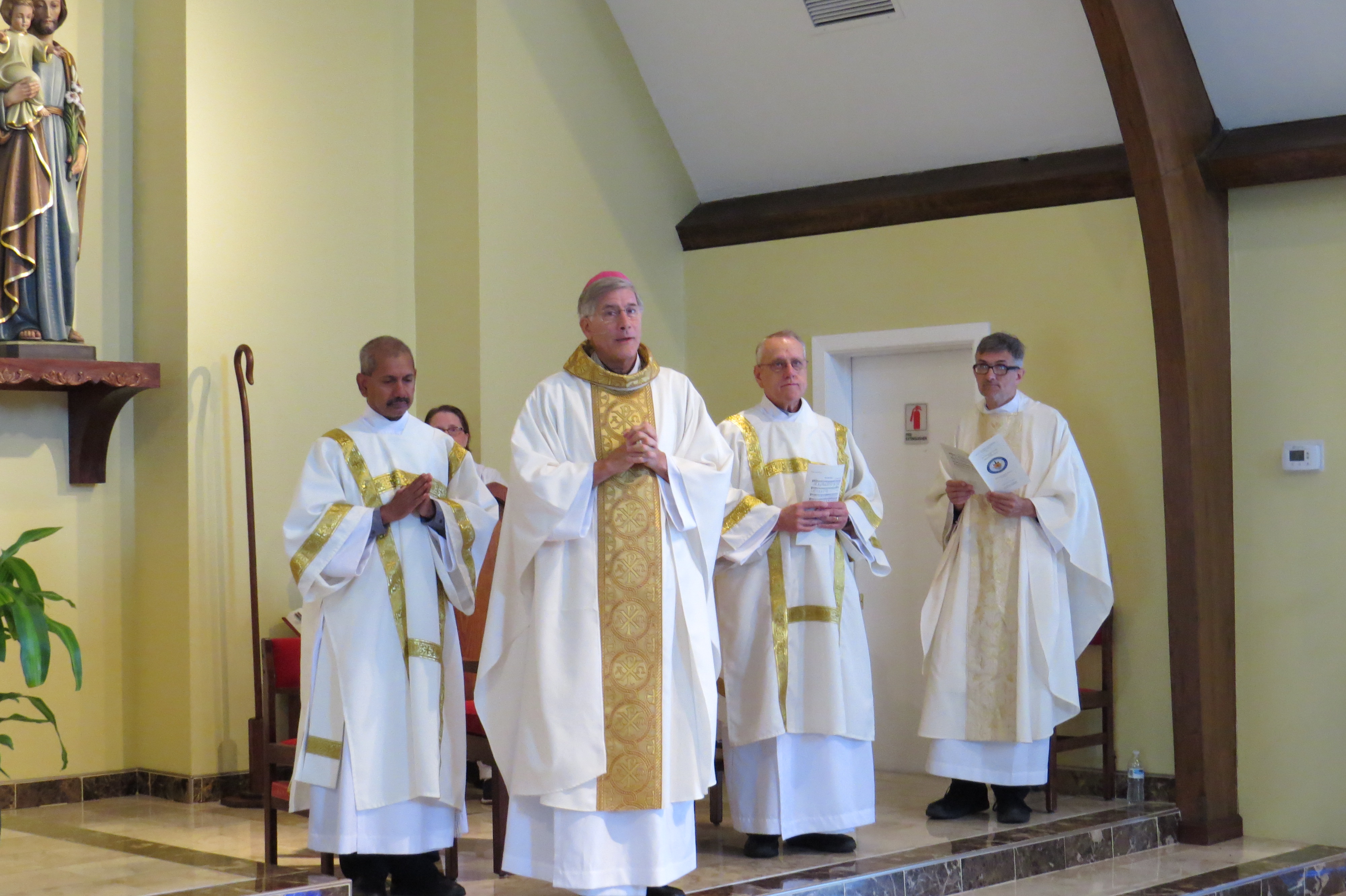 PEARL – Bishop Joseph Kopacz admitted nine men to candidacy for the permanent diaconate on Saturday, Sept. 8, during a Mass for the Feast of the Nativity of the Blessed Virgin Mary at St. Jude Parish. The men and their families have spent a year in what is called aspirancy, spending time together in study, prayer and discernment. Candidacy is the next step in their five-year journey. They will continue with study and formation in hopes of being ordained for the diocese. Permanent deacons dedicate themselves to service to the church. The candidates are (l-r, not all faces visible) Mark Bowden, Dien Hoang, Kayed Jwainat, Wesley Lindsay, John Pham, David Rouch, Anthony Schmidt, and Edwin Wilson. (Photo by Rhonda Bowden)