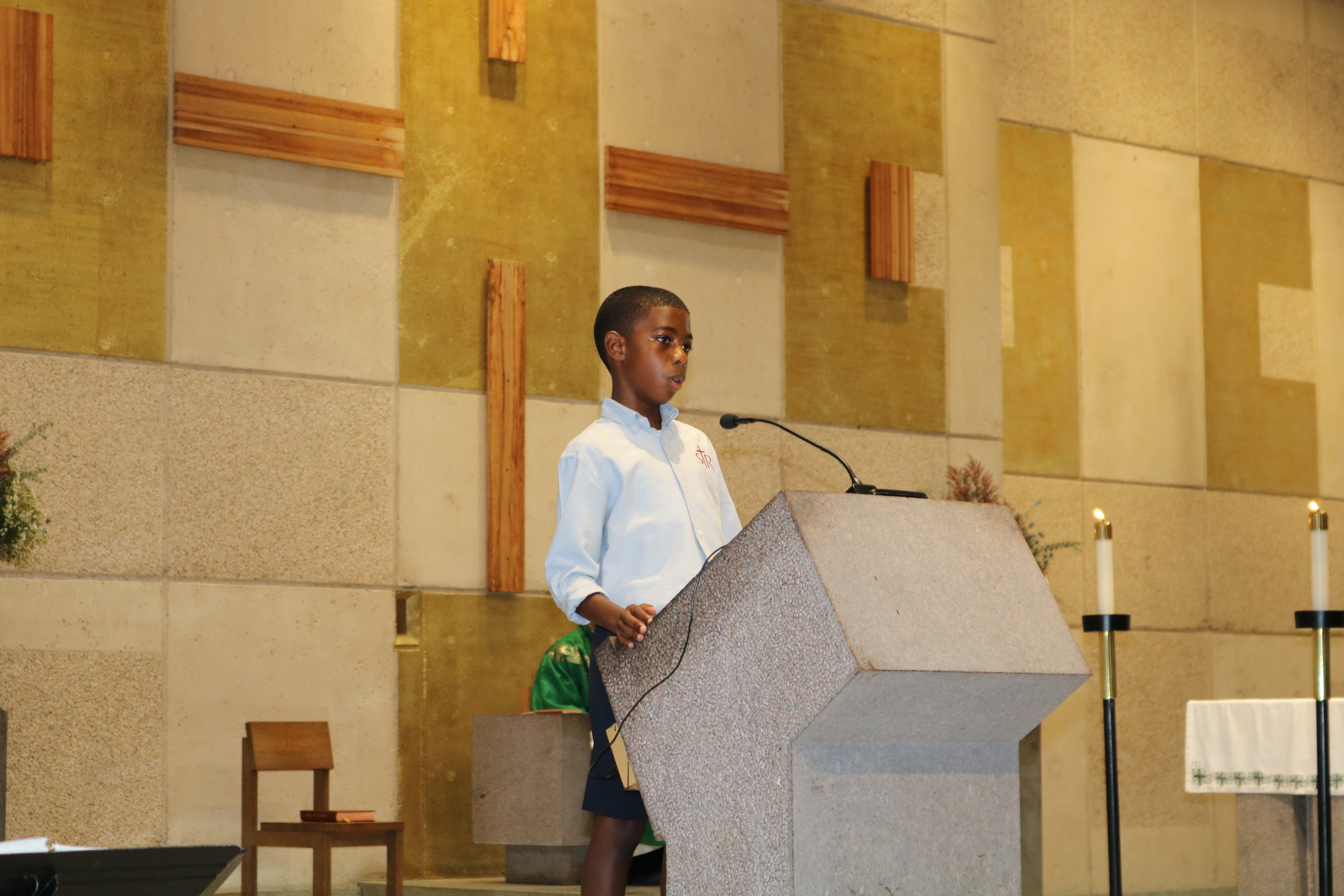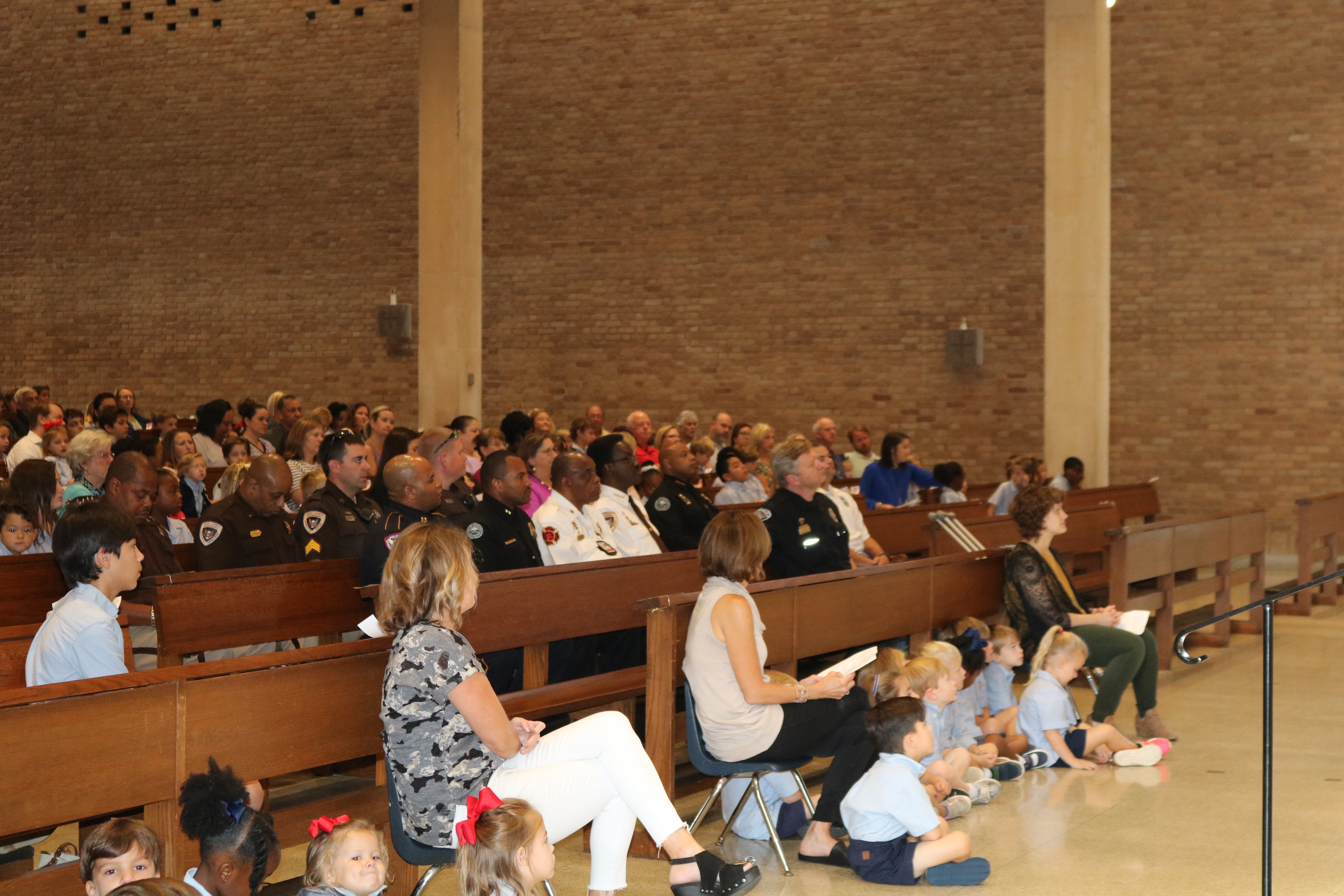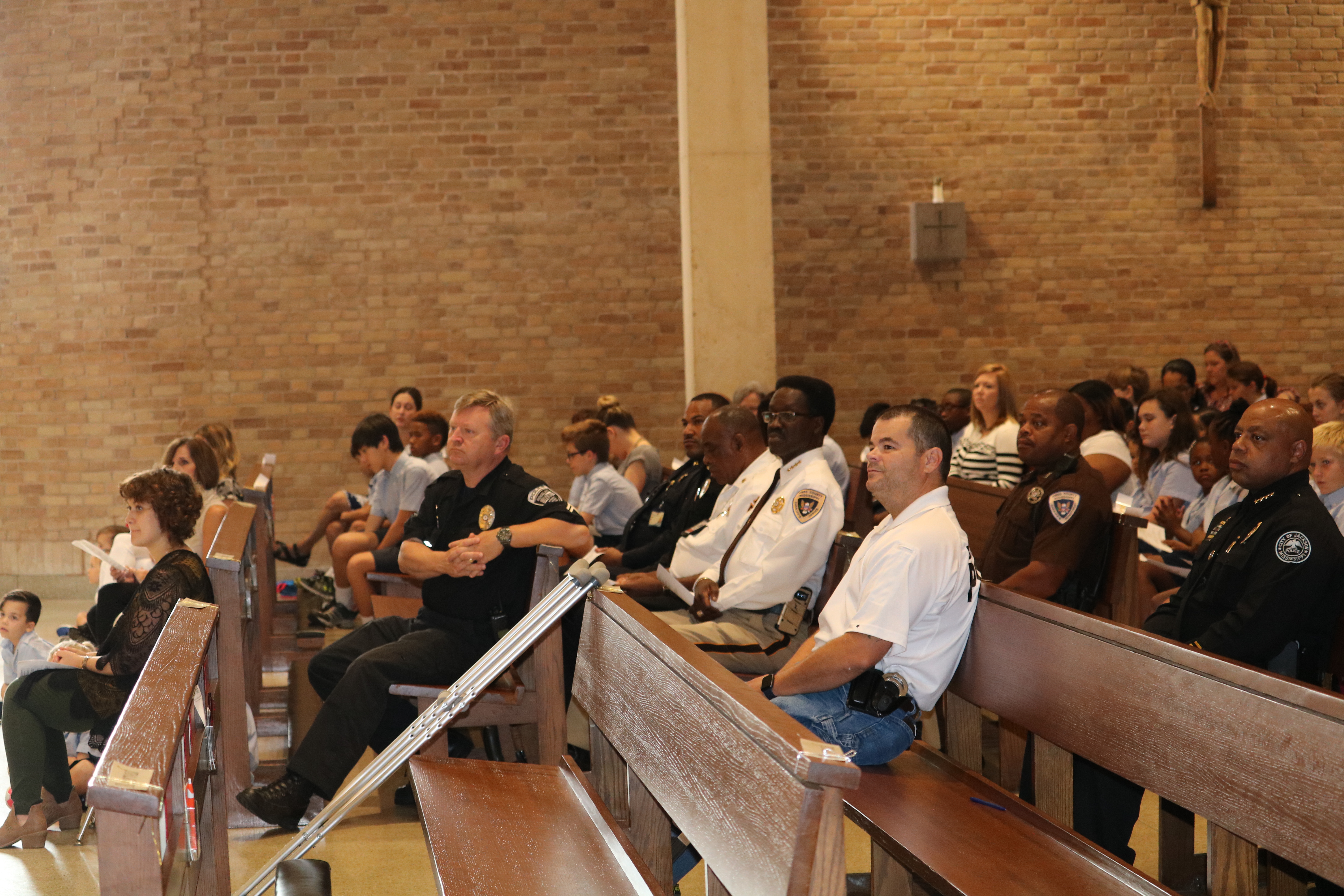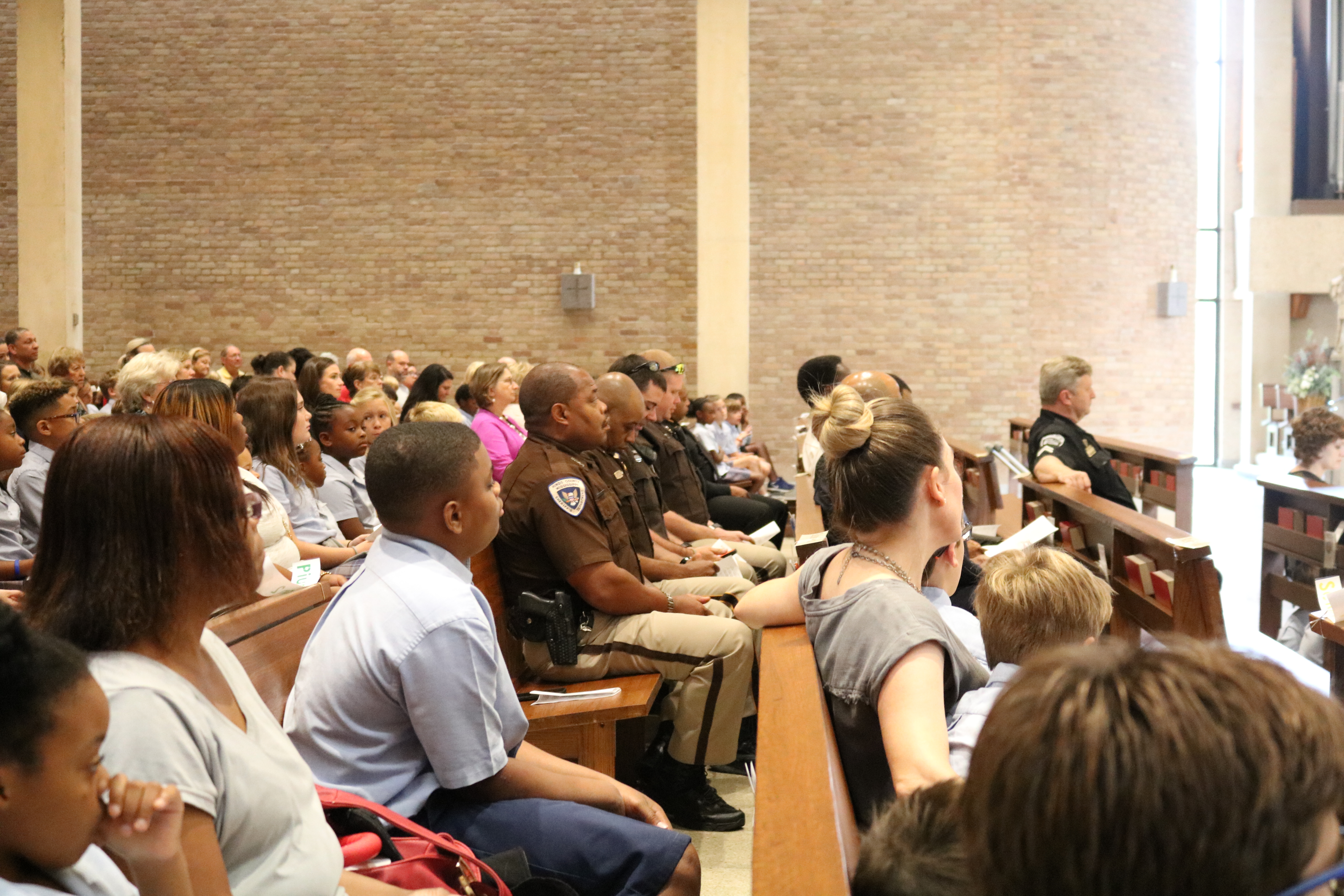 JACKSON – On Wednesday, Sept. 12, St. Richard School participated in a 70-year old Catholic tradition by blessing and praying for first responders at a “Blue Mass.” Above, local officers, deputies, paramedics and firefighters receive their blessing. At right, fourth-grader Aiden Wheatley reads scriptures at Mass. After Mass, the Knights of Columbus provided a breakfast for the guests.(Photos by Wendi Shearer)