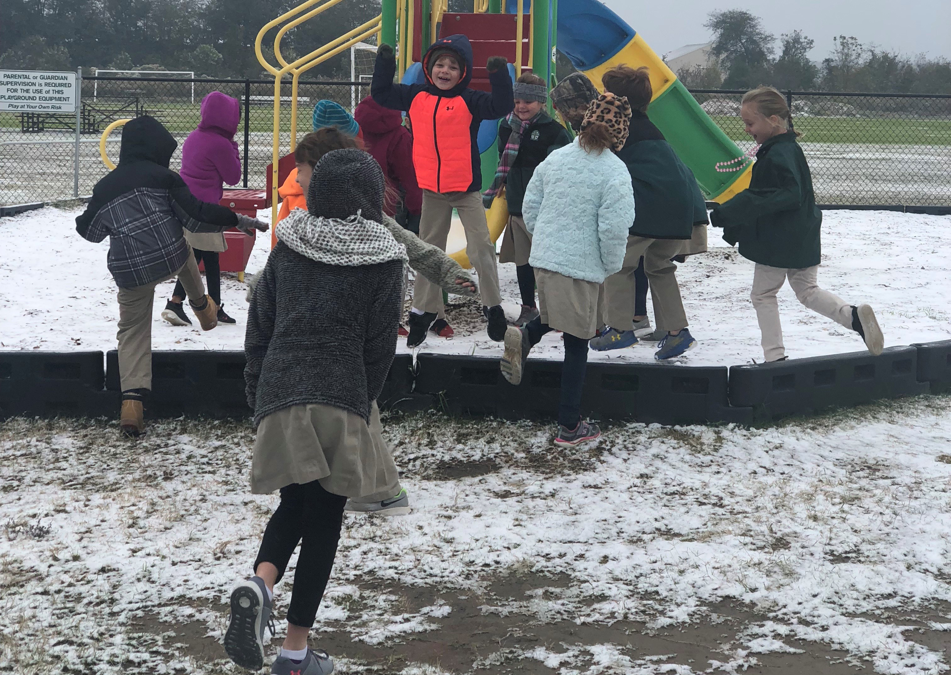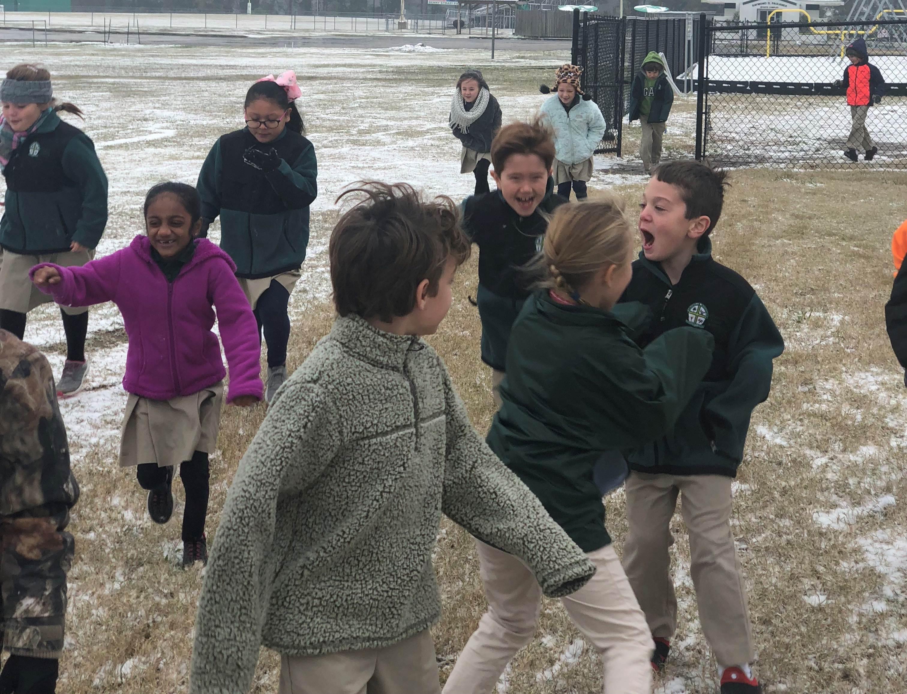 GREENVILLE – The first-graders at St. Joseph School got to play in a dusting of snow on Wednesday, Nov. 14. Above, Carson Triplett shouts for joy on the plyaground. There was not enough snow to cancel school in Greenville, but the children still got to take some time to enjoy it. (Photos by Craig Mandolini)