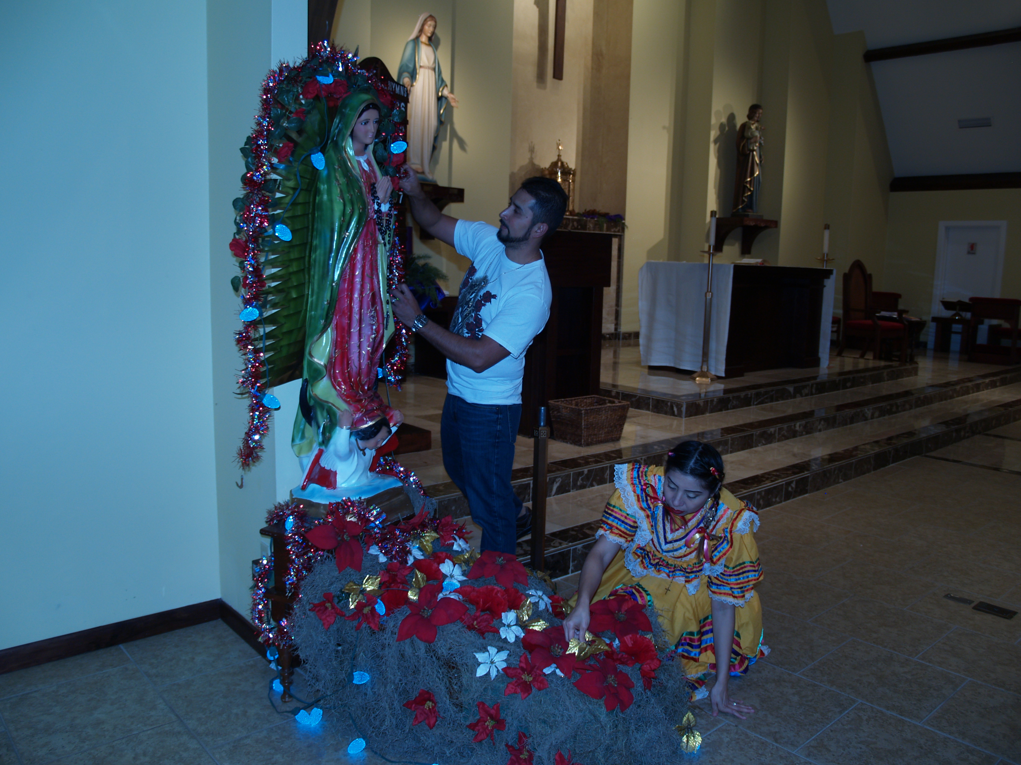 Pearl. Ismael y Nadia García le presentan sus respetos a la virgen. Los dos se han encargado por dos años de preparar esta celebración en St. Jude cuando recibieron todo el apoyo del padre Lincoln. Luis dice que el amor a la virgen “ha fortalecido mi fe, la virgen es mi madre adoptiva” y Nadia baila para la Virgen.