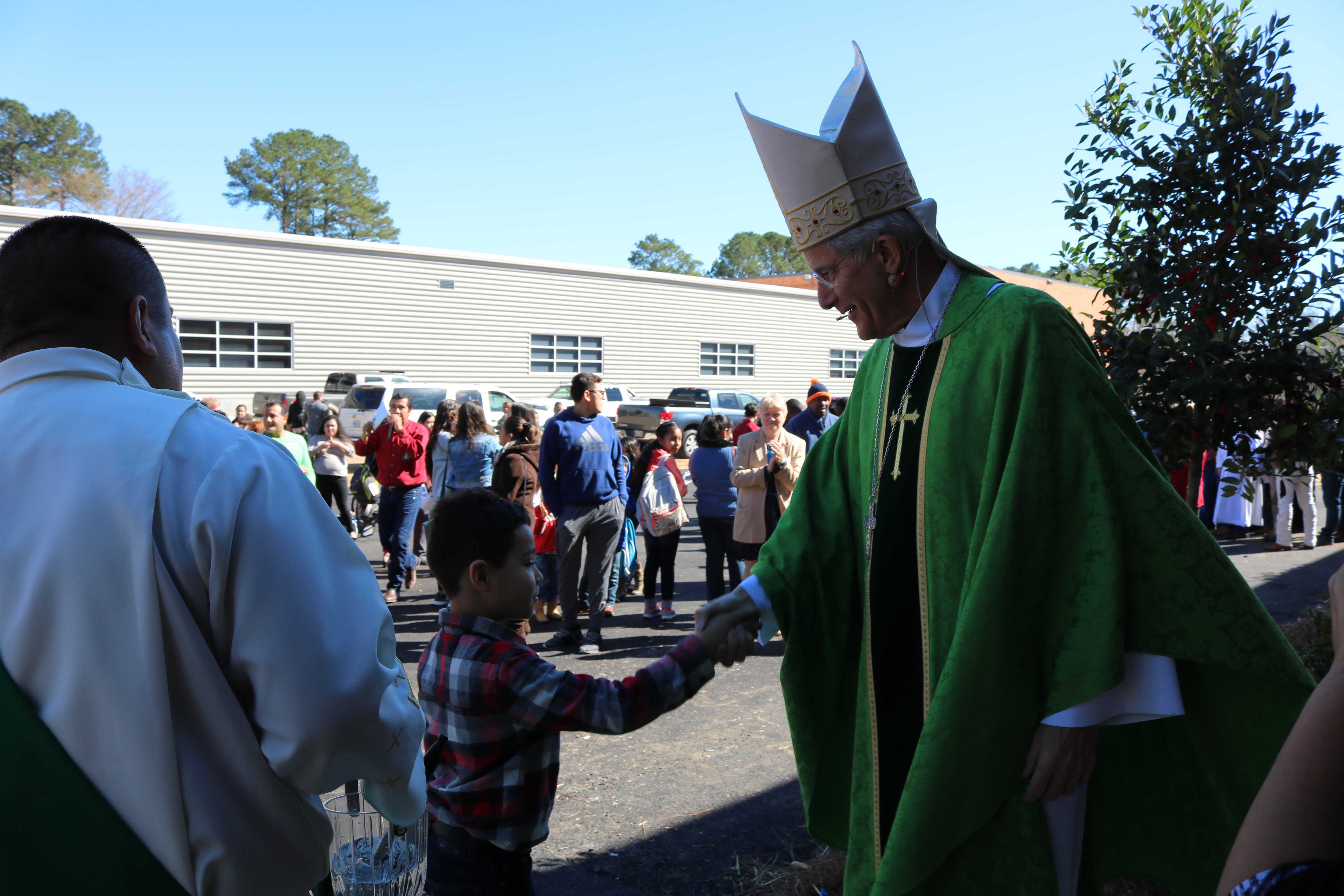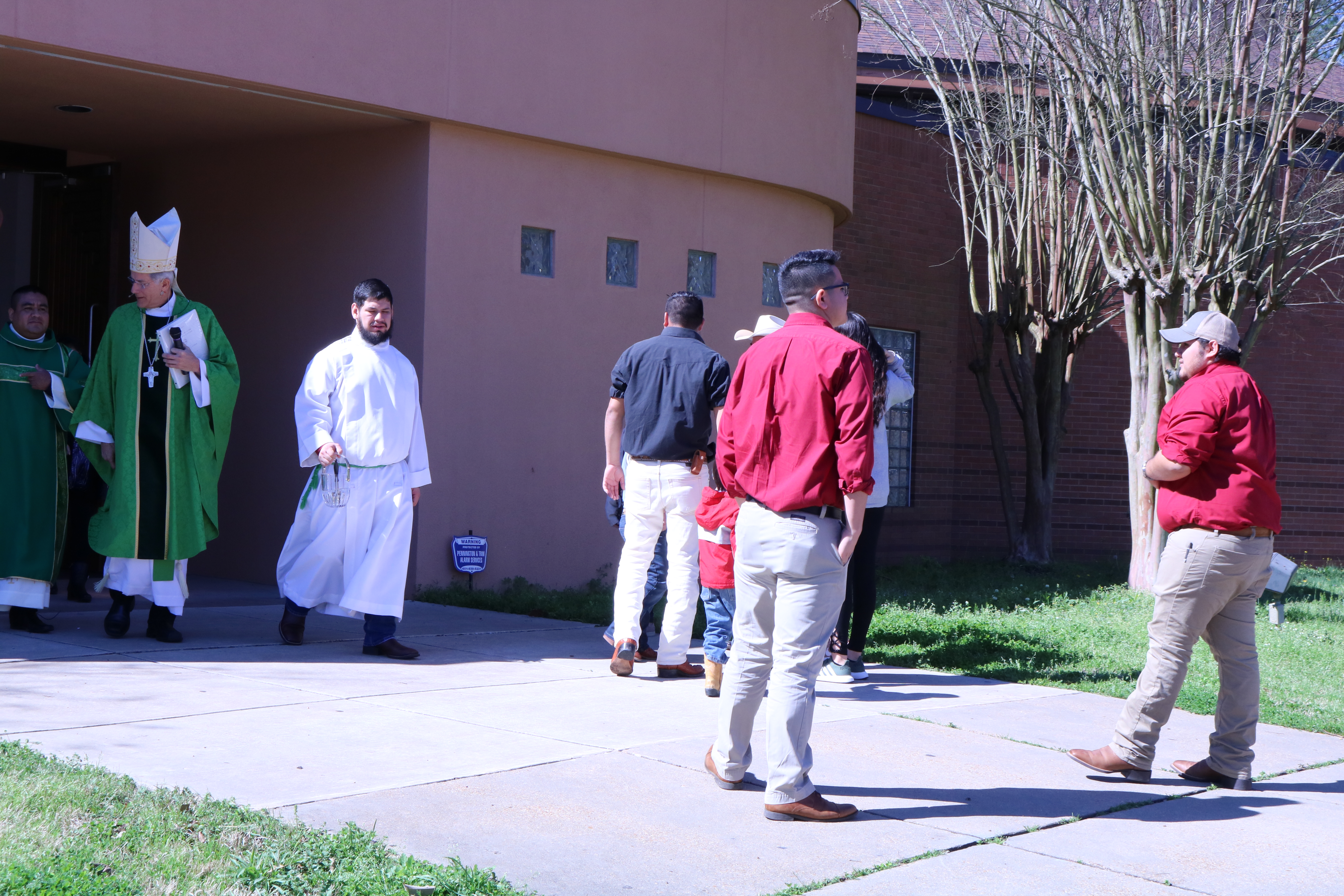 JACKSON – Sunday, Feb. 24, was a sunny and cool day, perfect for the dedication of St. Therese Parish New Life Building. After several days of rain, the weather cleared and Bishop Joseph Kopacz, Msgr. Elvin Sunds, pastor, Deacon Adolfo Suarez and parishioners stood outside the new building after the 12:30 bilingual Mass for the blessing and dedication.