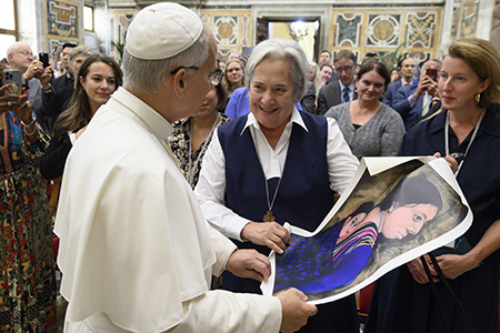 El papa León XIV recibe un cuadro de la hermana Norma Pimentel, artista, misionera de Jesús y directora ejecutiva de Catholic Charities of the Rio Grande Valley en Brownsville, Texas, durante una audiencia en el Vaticano el 2 de octubre de 2025. (Foto CNS/Vatican Media)