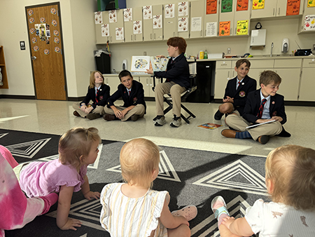 JACKSON – St. Richard Catholic School sixth graders Reeves Buckley, Masters Neel, Andrew Compretta, Jackson LeBlanc and Drew Simmons visit the St. Richard Early Learning Center, spending time reading and playing with students in different classrooms. (Photo by Celeste Saucier)