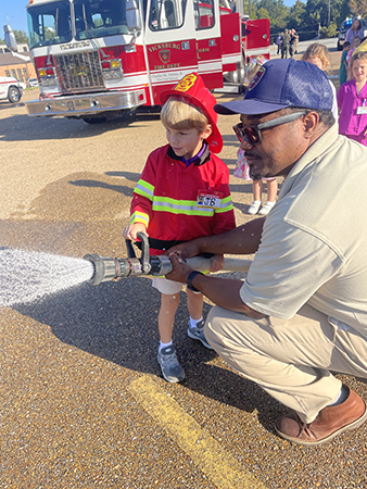 VICKSBURG – Vicksburg Catholic School student JB Barnes learns how to use a fire hose with help from a local firefighter during Community Helper Day. (Photo by Laura Kidder)