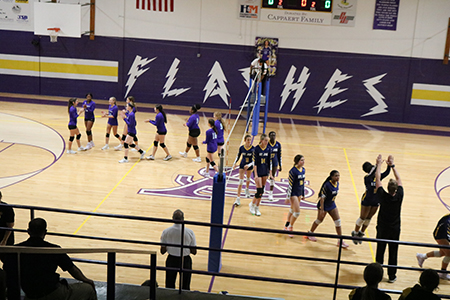 VICKSBURG – The Vicksburg Catholic School Lady Flashes and the St. Joseph Catholic School Lady Bruins meet on the court for a volleyball match on Oct. 7. (Photo by Tereza Ma)