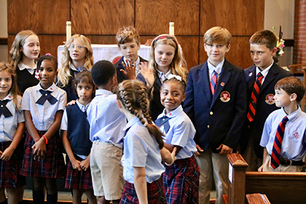 JACKSON – St. Richard Catholic School second graders are paired with sixth-grade “Guardian Angels,” who serve as guides, mentors, prayer buddies and friends throughout the year as the younger students prepare for First Reconciliation. Pictured (back row, from left) are Rachel Jones, Addy McKay, Cody Gage-Spencer, Addy Boteler, Thomas Ueltchsey and Masters Neel; (front row, from left) Marilee Nelson, Malia Owens, Corinne Thomas, Isaiah Bost, Cecilia Brown, Marleigh Walker and Thomas Morisani. (Photo by Celeste Saucier)