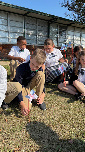 MERIDIAN – (left) St. Patrick Catholic School students Myles Owen, foreground, Josiah Rogers and Carolyn Augustine plant pinwheels on Sept. 18 in observance of the International Day of Peace. (Photo by Helen Reynolds)