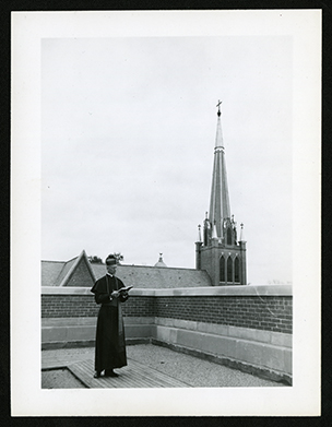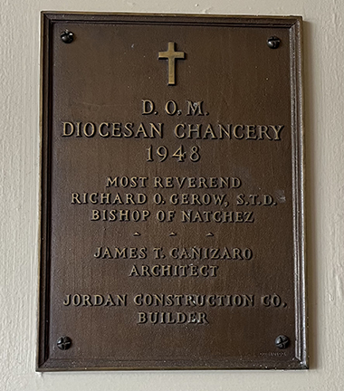 Bishop Gerow prays on roof of the diocesan chancery building in Jackson on Dec. 12, 1948. On right, the dedication plaque for the diocesan chancery building located in the Smith Park Architectural District of Jackson.