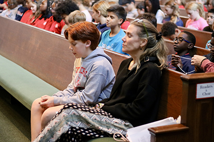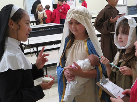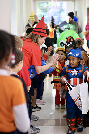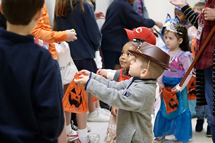 JACKSON – At St. Richard Catholic School’s Halloween celebration, sixth graders led Pre-K students trick-or-treating through the halls. (Above) Teacher Sheila Foggo high-fives students as they pass her classroom. (Left) JD Poole and Drue Beal visit older students who handed out candy to the youngest trick-or-treaters. (Photos by Celeste Saucier)