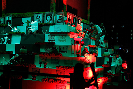 La tradición se ha convertido también en un espectáculo, gracias a la película de James Bond de 2015, Spectre, que incluía un desfile apócrifo del Día de Muertos. Las autoridades turísticas mexicanas copiaron el desfile, con marionetas gigantes de esqueletos, que atrae a multitudes al centro de la Ciudad de México.