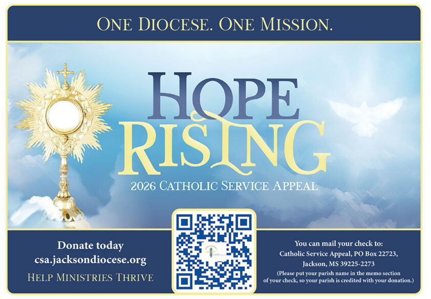 DIOCESE – Engaged Encounter 2026 dates, Feb. 27 – March 1; May 1-3; Aug. 28-30; Oct. 2-4. Details: couples may register at https://jacksondiocese.flocknote.com/signup/230073 or email debbie.tubertini@jacksondiocese.org.