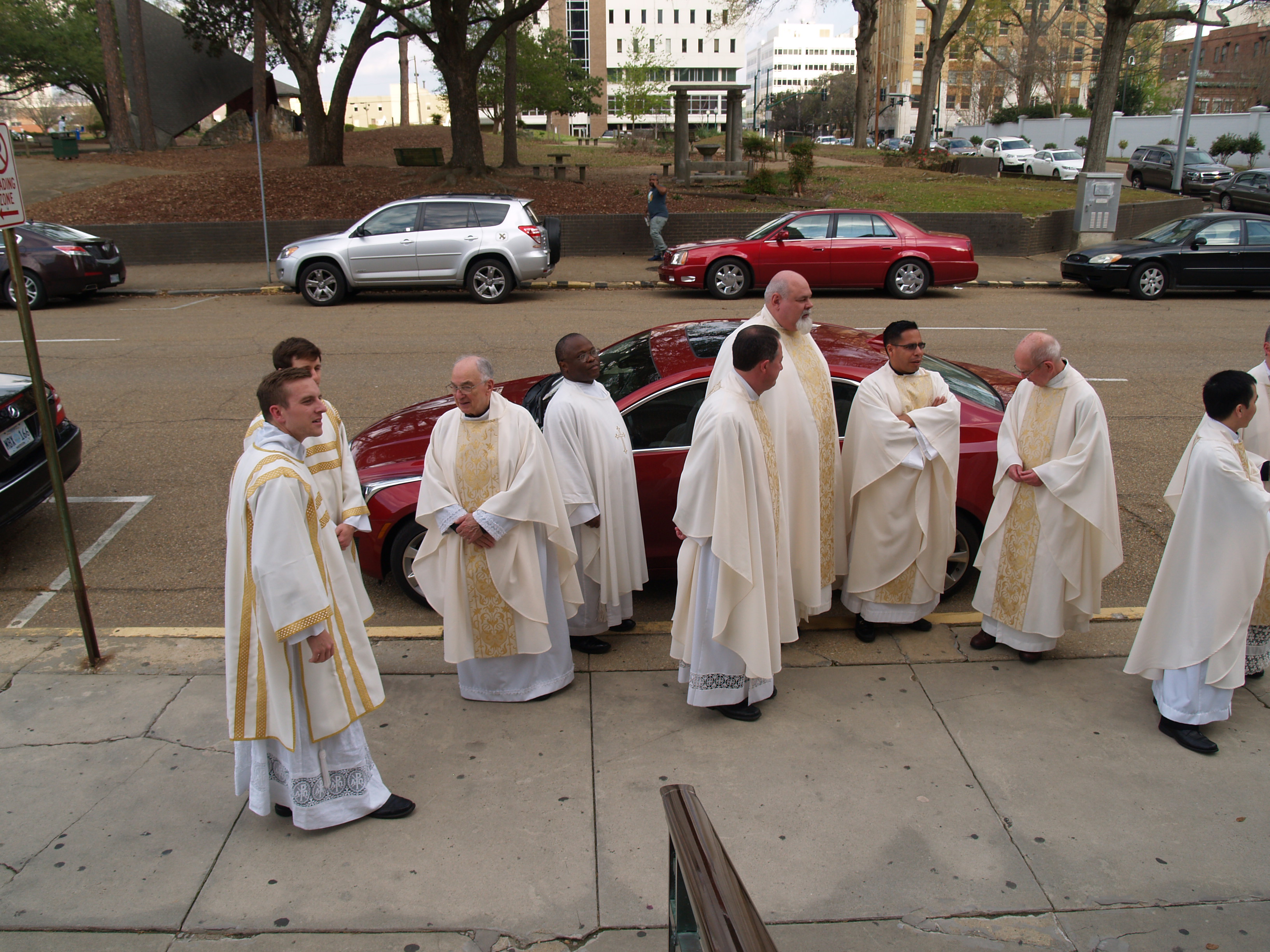 JACKSON – Deacon Nick Adam, left, Bishop Joseph Kopacz and Deacon Aaron Williams leave the cathedral after Williams’ ordination Saturday, March 18. See details of both ordinations on pages 8-9. (Photo by Maureen Smith)