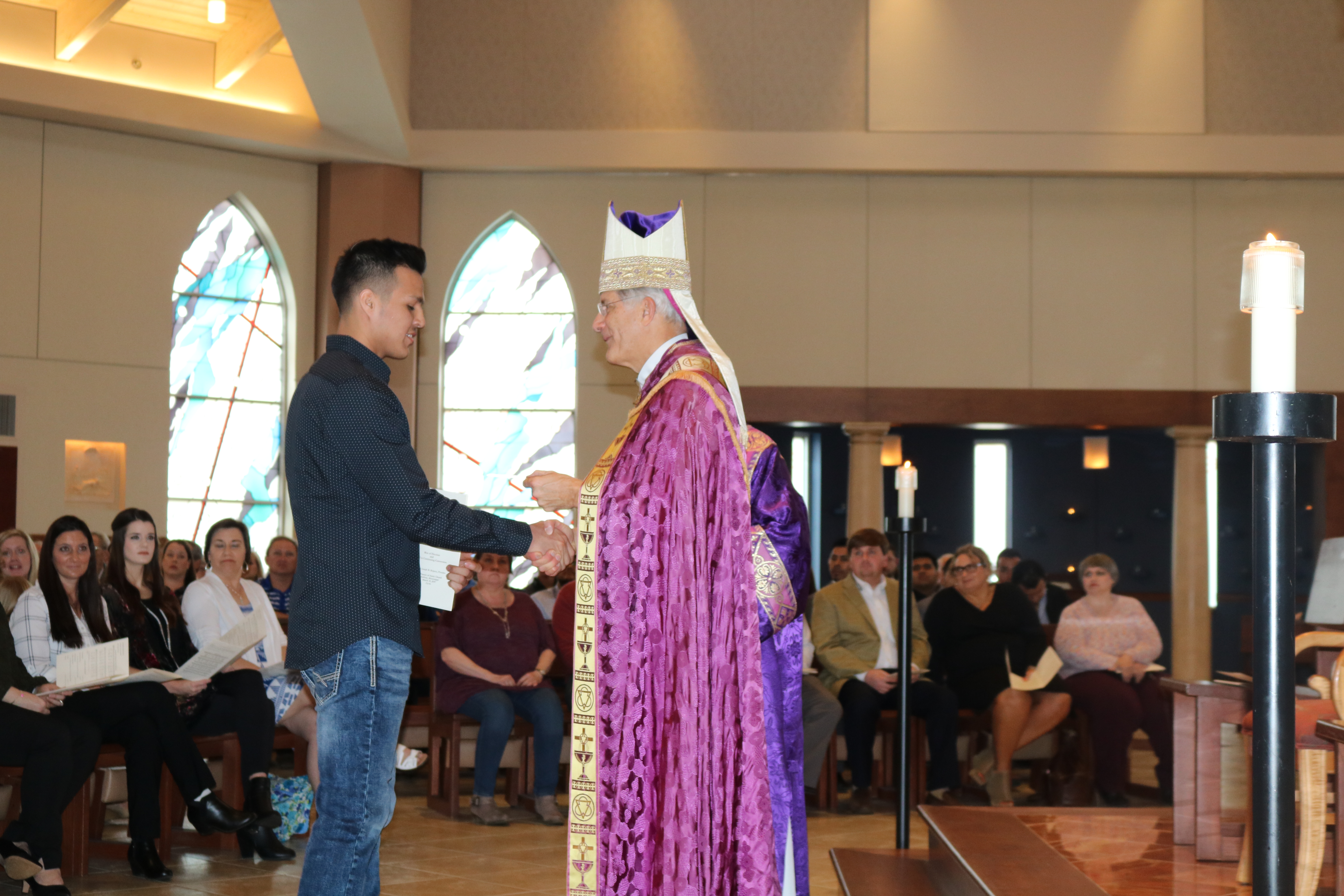 JACKSON – Bishop Joseph Kopacz congratulates youth winners of the Bishop Chanche service award during the Mass on Saturday, Feb. 24. (Photos by Maureen Smith)
