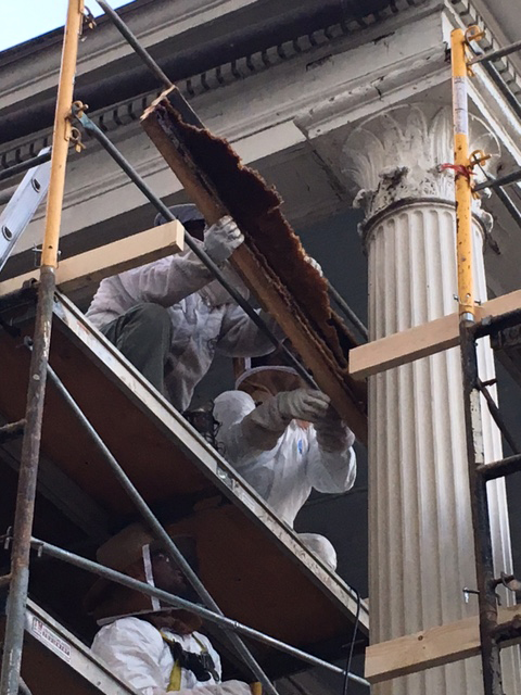 Workers drilled holes in the column and used a camera to precisely locate the hive. Then, they carefully cut the wood around the hive to remove a whole section from the column, bringing with it 10-years worth of honeycomb, honey and insects. “As bees build a nest, they continue to make it go down every year. They start at the top and as they have space they will go down. The column was about 20 inches inside and the bees have 3/8 of an inch crawl-space so they will suspend the combs and build from there,” Everett captured the queen bee and drew the workers out to her. The whole operation, started in the late afternoon, took about three hours. He guessed there was about 50 pounds of honey in this hive.
