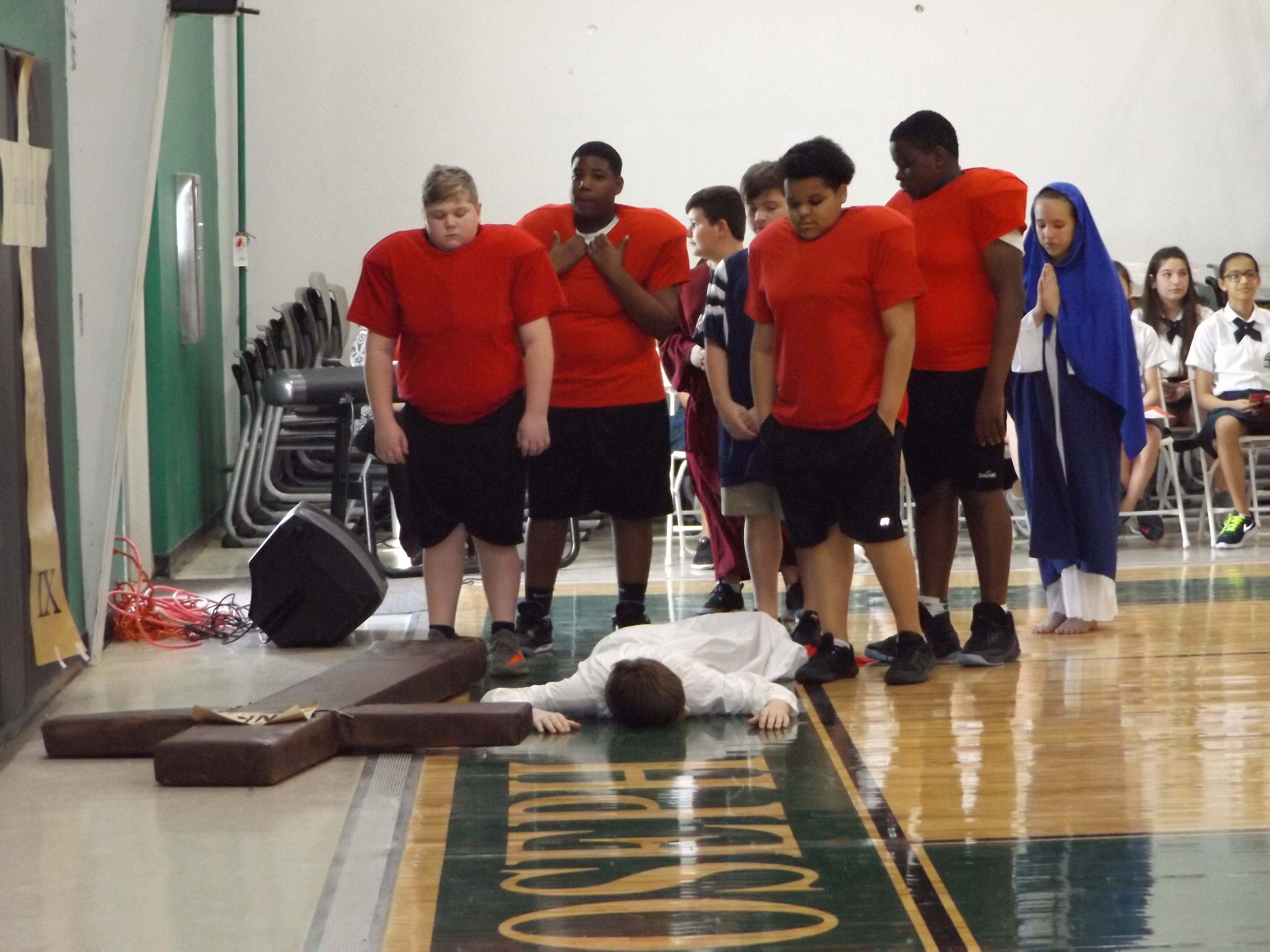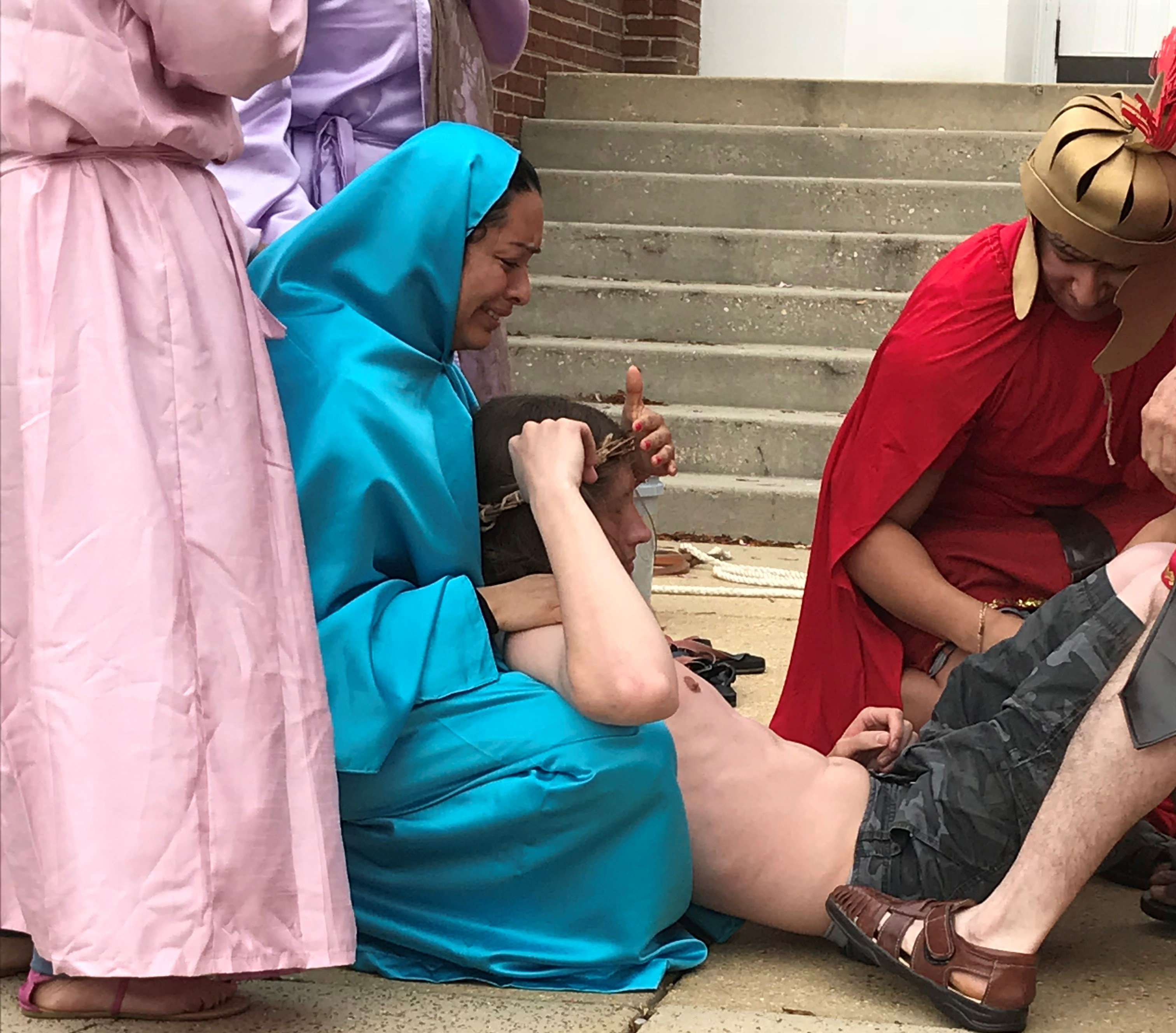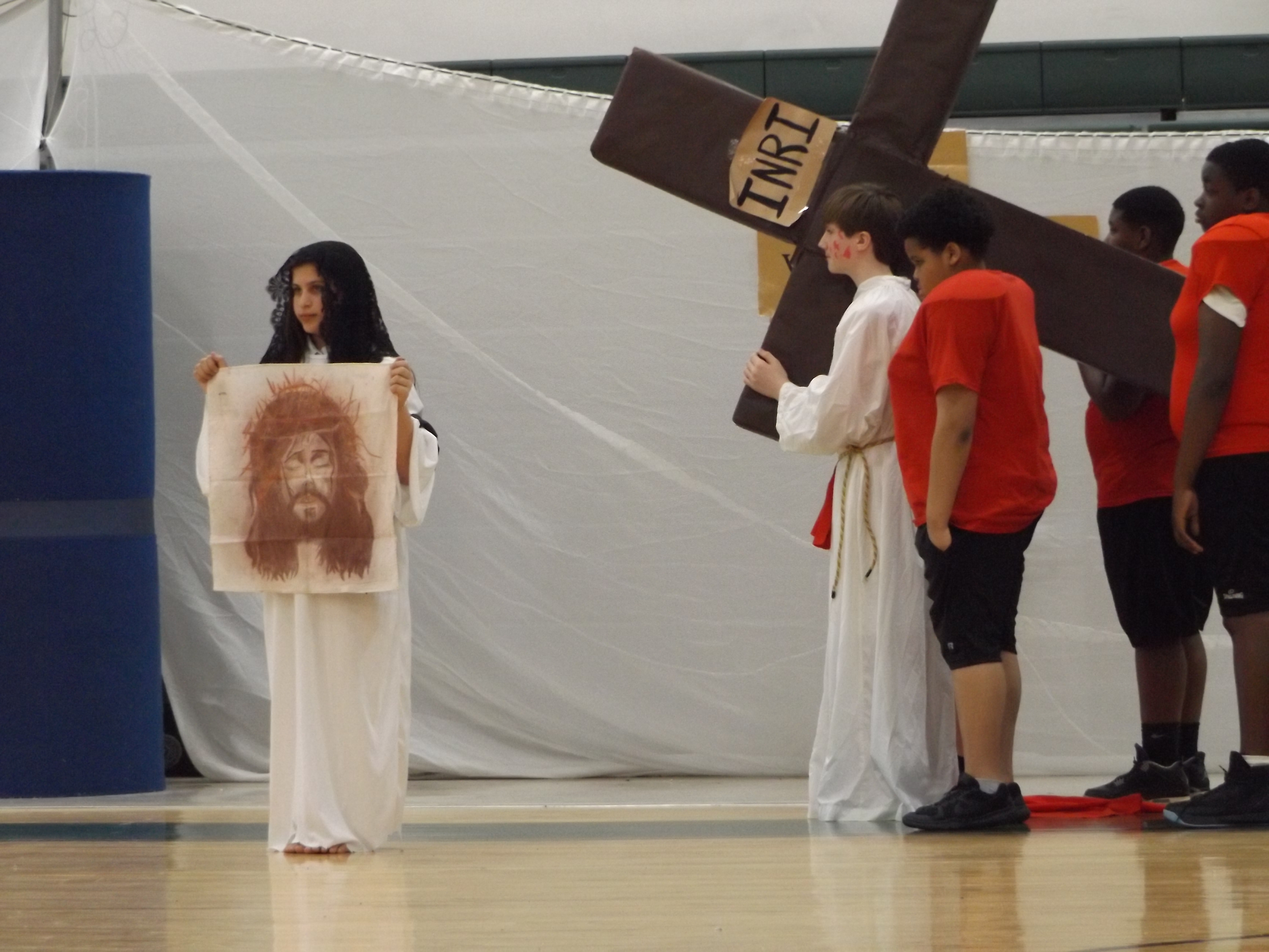 GREENVILLE – Live stations of the Cross are a tradition for middle-schoolers at St. Joseph School. In left photo, Jesus falls the second time. (Photo by Missi Blackstock)