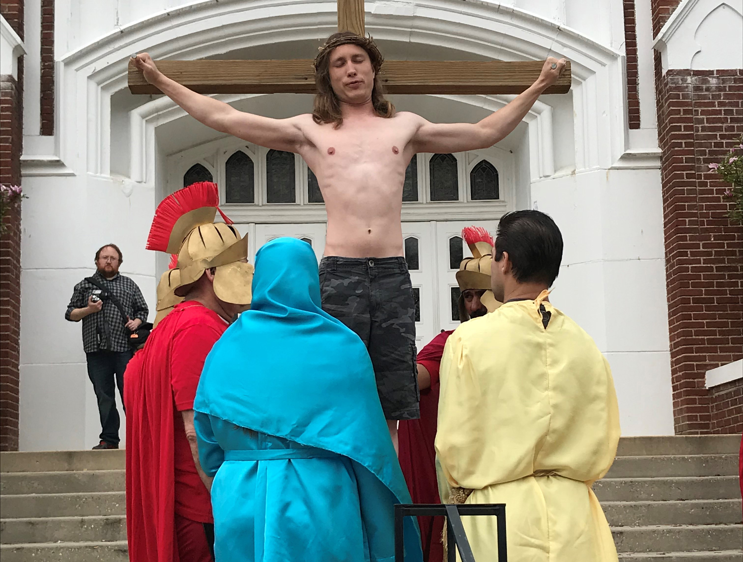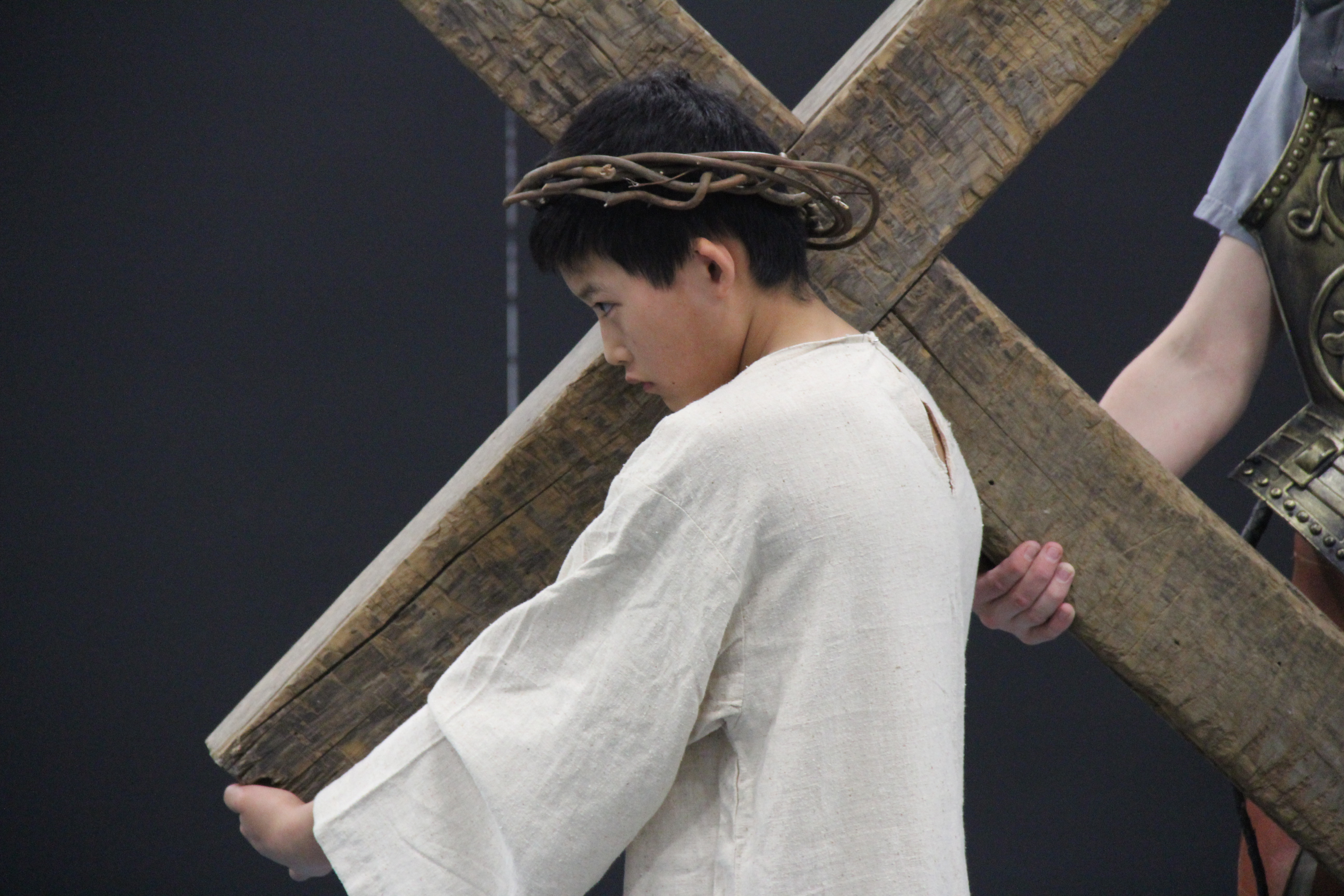 NEW ALBANY – Cody Carson depicts Christ as the youth of St. Francis of Assisi Parish lead an outdoor live stations of the cross. They started the tradition in 2012, inviting anyone of any faith to join in this memorial of Christ’s passion.