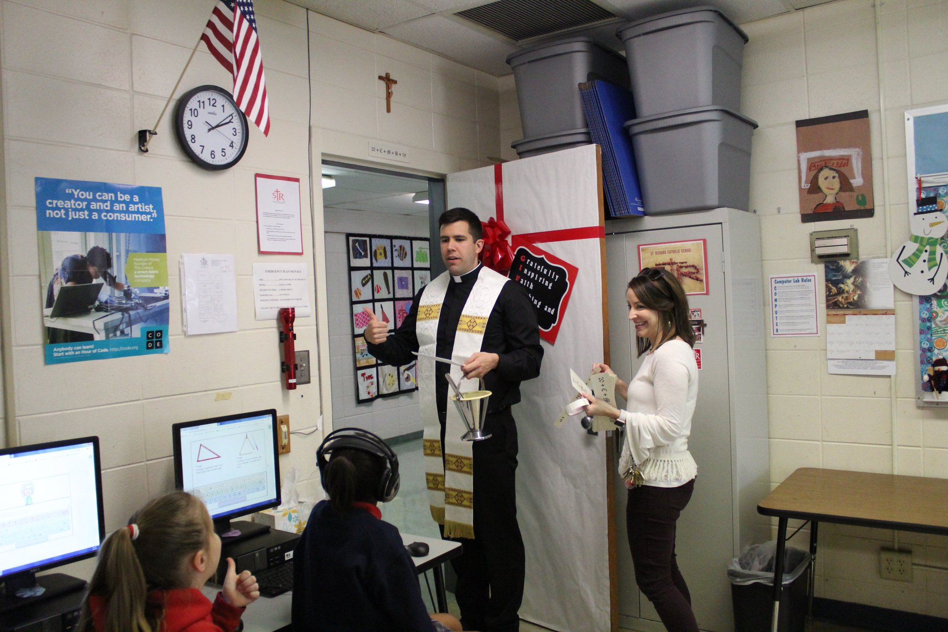 VICKSBURG – Father Rusty Vincent greets from right to left, (with baby) Sarah Franco Pinson, Velma Robichaux, Mary Myers Franco Mitts, and Denise Franco during a reception to welcome Father Vincent to St. Paul Parish Sunday, Feb 3. (Photo by Connie Hosemann)