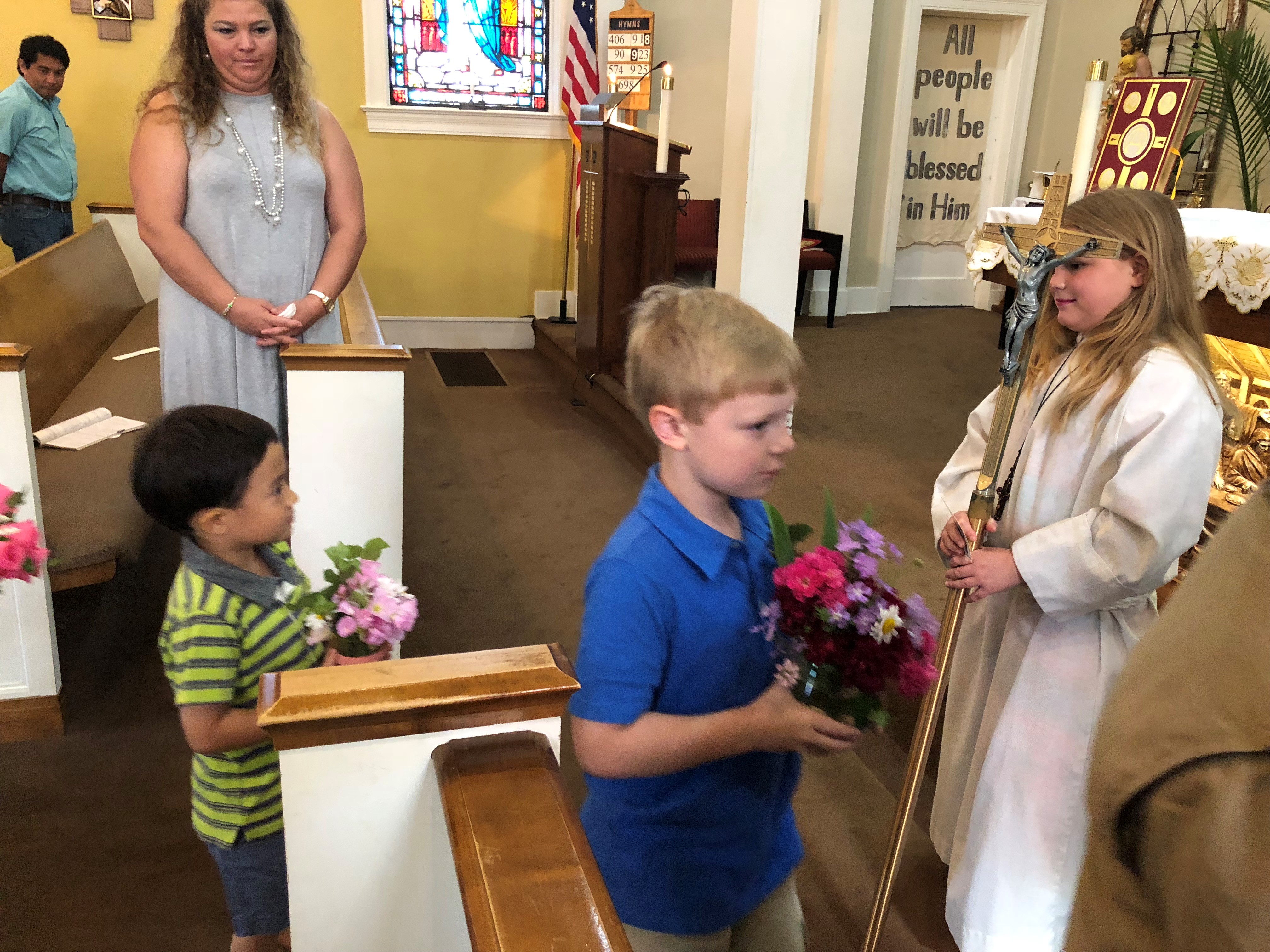 Far Left, Father Nick Adam thanks those who attended his first Mass at Jackson St. Richard. Center, Father Adam with nine of his 12 neices and nephews after Mass. At right, Father Adam blesses Cy Steven, who was an altar server for the first Mass. (Photos by Maureen Smith and Julie Bordes)