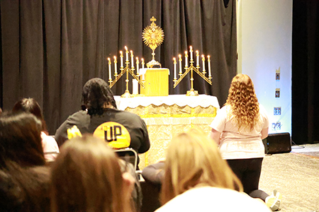 While the teens lead the retreat, adult leaders and clergy serve largely behind the scenes. Deacon Will Foggo assisted throughout the weekend and led adoration and benediction, helping guide the teens in prayer and worship. Seminarians Joe Pearson and Henry Haley were also present, offering witness talks and spending time with participants to share about vocational discernment and life in seminary.