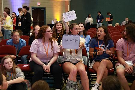 Youth react during a group game at DCYC, using emoji clues to identify moments from Scripture. Can you solve the emoji clue above?Bishop Joseph Kopacz is pictured with Bishop Chanche Youth Award recipients, from left, Cheyenne Vrbicky of Holy Cross, Phildelphia; Jessie Torres of Sacred Heart, Greenville; Gabriel Theunissen of St. Joseph, Greenville; Edwin Sebastian of St. Michael, Forest; Amenia Rozzelle of St. Alphonsus, McComb; James Ross of St. Joseph, Meridian; Dori Paczak of St. Jude, Pearl; Arely Gomez of St. Patrick, Meridian; Alexander Glass of St. Francis, Madison; Kameron Fox of Holy Ghost, Jackson; Hayden Bell of St. Paul, Vicksburg; and Anna Christine Antici of St. Joseph, Gluckstadt.