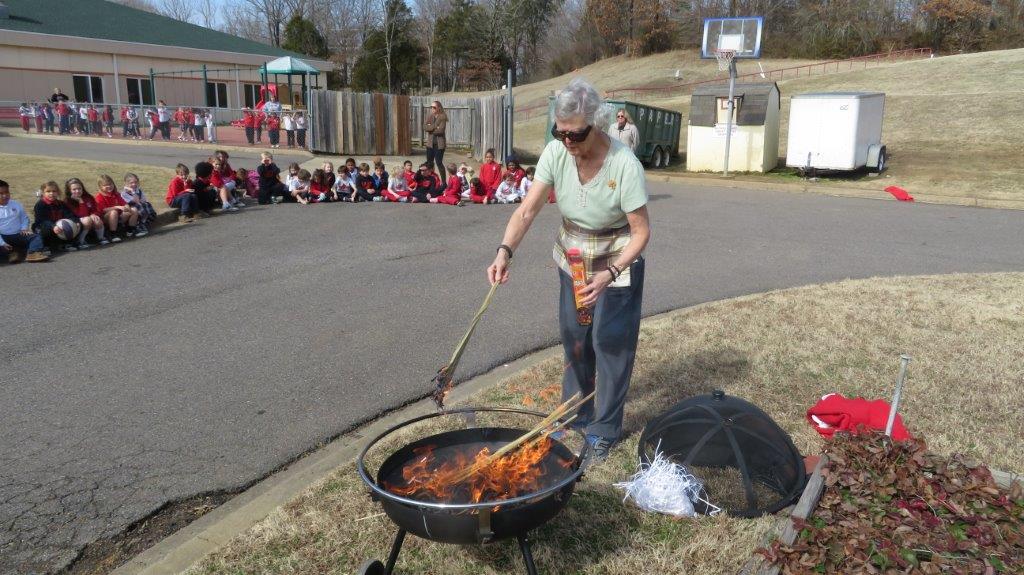 SOUTHAVEN – Sister Margaret Sue Booker shows students how last year’s palms from Palm Sunday become this year’s ashes for Ash Wednesday. Sister Booker has made a tradition of bringing the students outside to watch the fire and talk about the Liturgical seasons. (Photo courtesy of Laura Grisham)