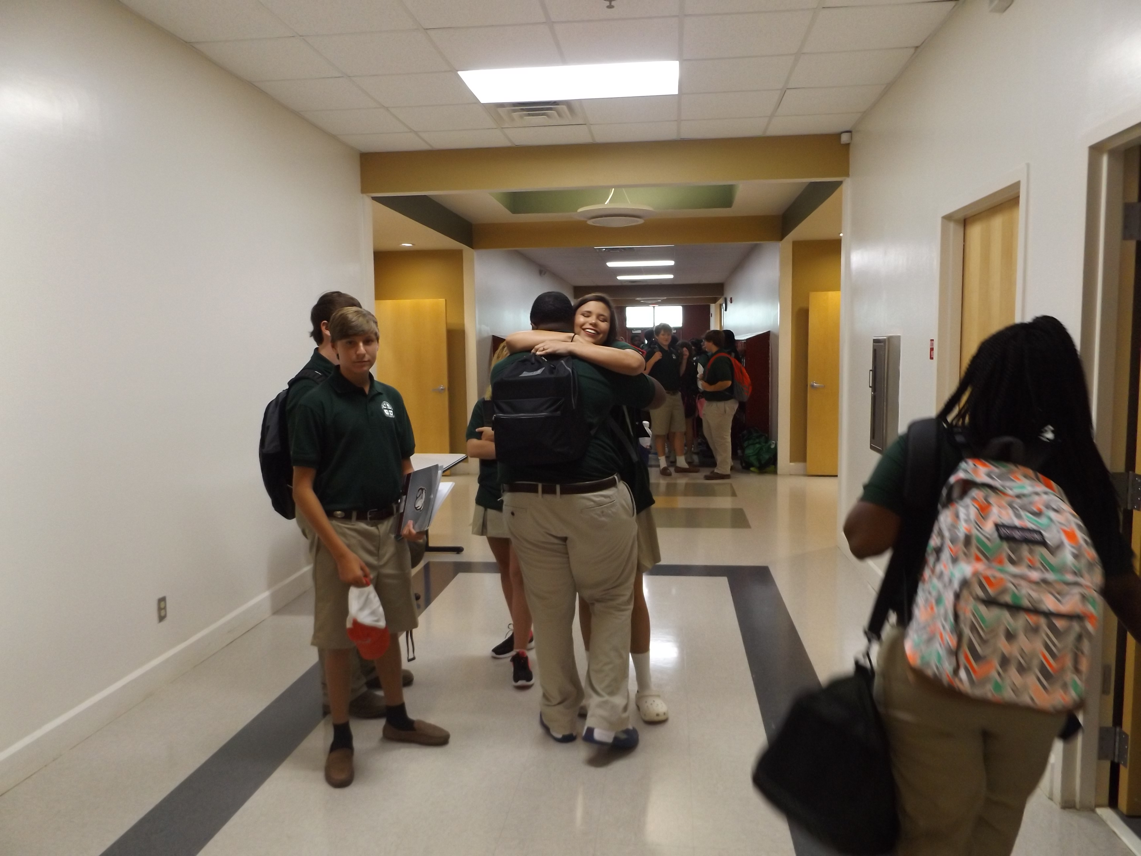 GREENVILLE – Friends reunite in the halls on the first day of class for St. Joseph school in Greenville. The unit school has new principals for both the elementary and high schools this fall.(Photo by Missi Blackstock)