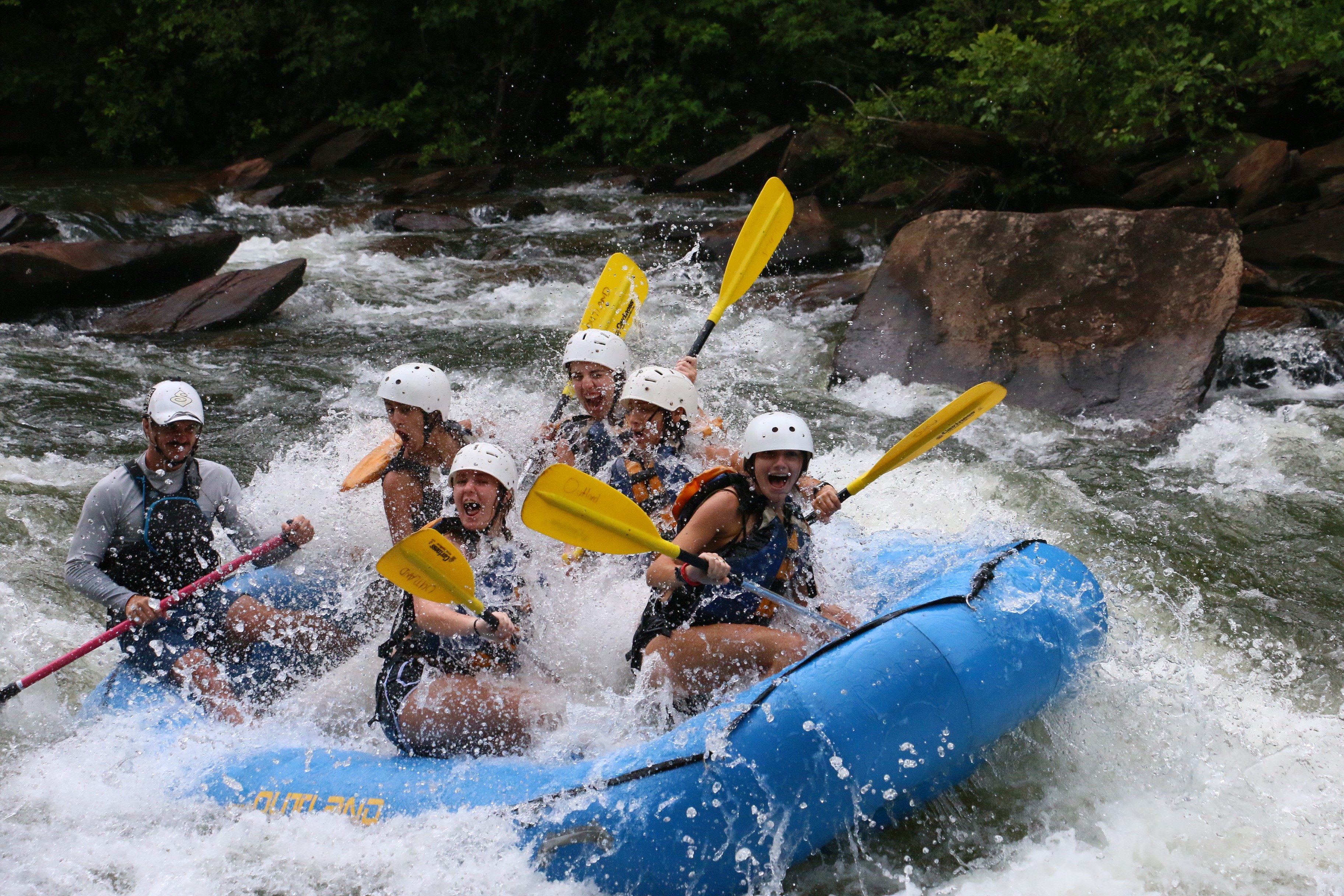 CHATTANOOGA – Eight girls from Clarksdale St. Elizabeth Parish attended Alive in You Catholic Service Camp and Conference in Chattanooga, Ten June 20-25. The girls worked an an area elementary school on the playground and painting classrooms and did a full yard cleanup for an elderly lady. On their day off, they took a white water rafting trip. At left, Olivia Watts, Madisen Lutts and Shelby Gordon spread mulch at the school. At right on the rafting trip, the guide is Evan from Outland Expeditions, Read Middleton, Madisen Lutts, Olivia Watts, Lauren Agostinelli, and Shelby Gordon. (Photos by Sarah Brooks Cauthen)