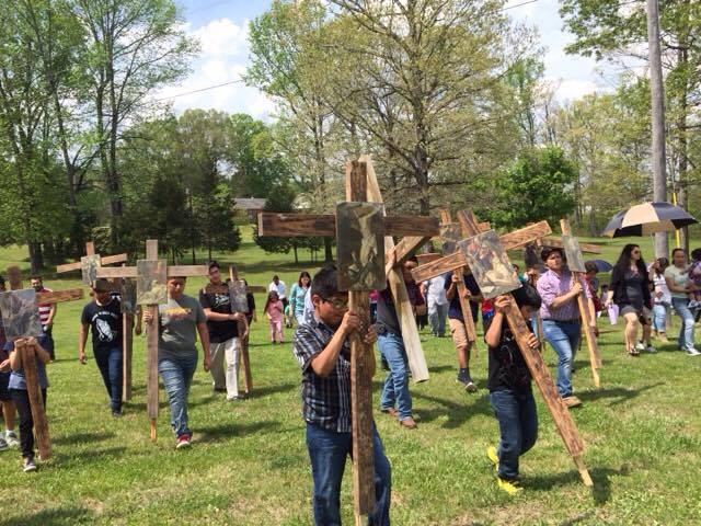 RIPLEY – The youth from St. Matthew Parish led stations of the cross outside during Holy week. Fourteen students participated in the hour-long devotion on the parish grounds. (Photo by Madeleine C. Hale)