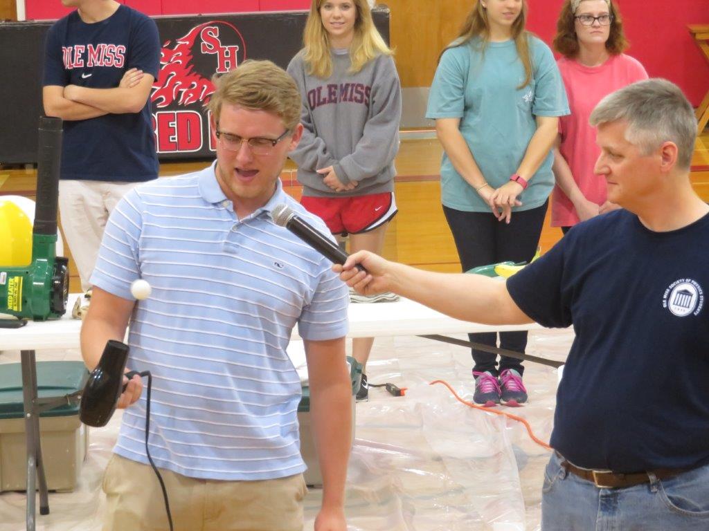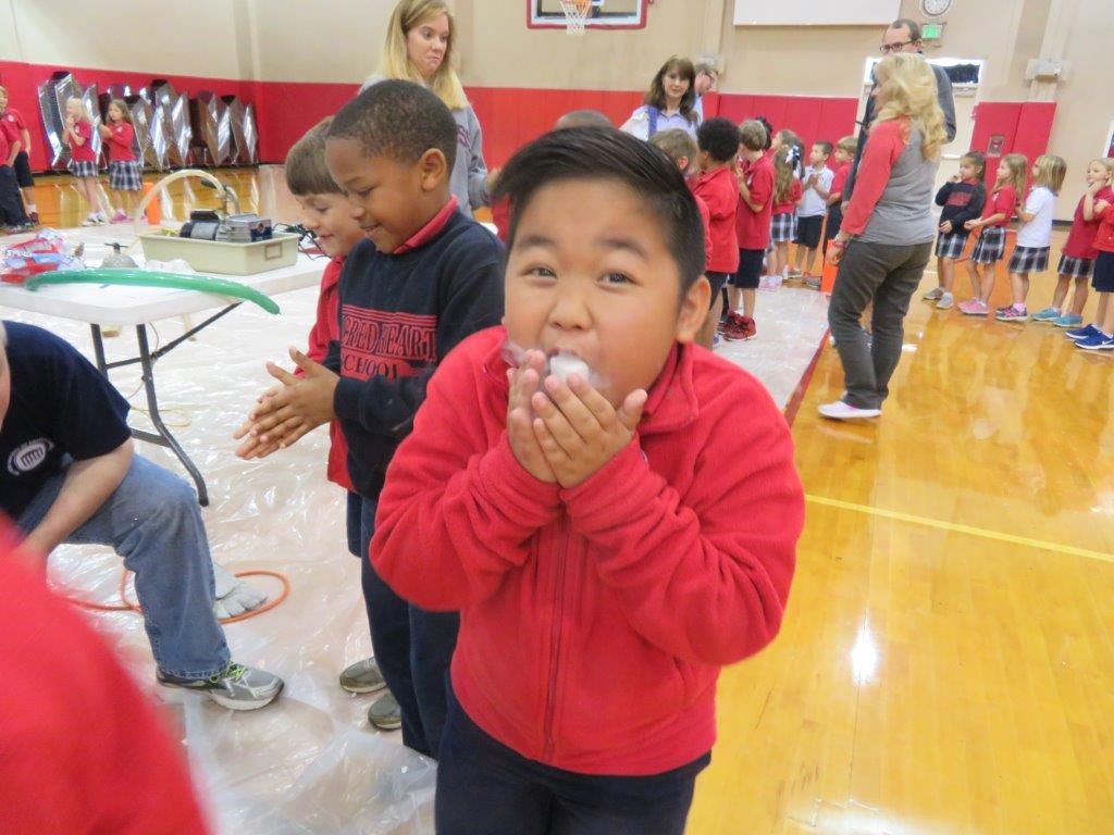SOUTHAVEN – University of Mississippi science professor Dr. Breese Quinn and some of his students wowed Sacred Heart school with demonstrations of physics and science. The students used air to levitate and direct ping-pong balls; distributed force to lay on a bed of nails and watched liquid nitrogen transform marshmallows transform into brittle frozen treats. Alex Pham, above, left, reacts to the cold. (Photos by Sister Margaret Sue Broker)