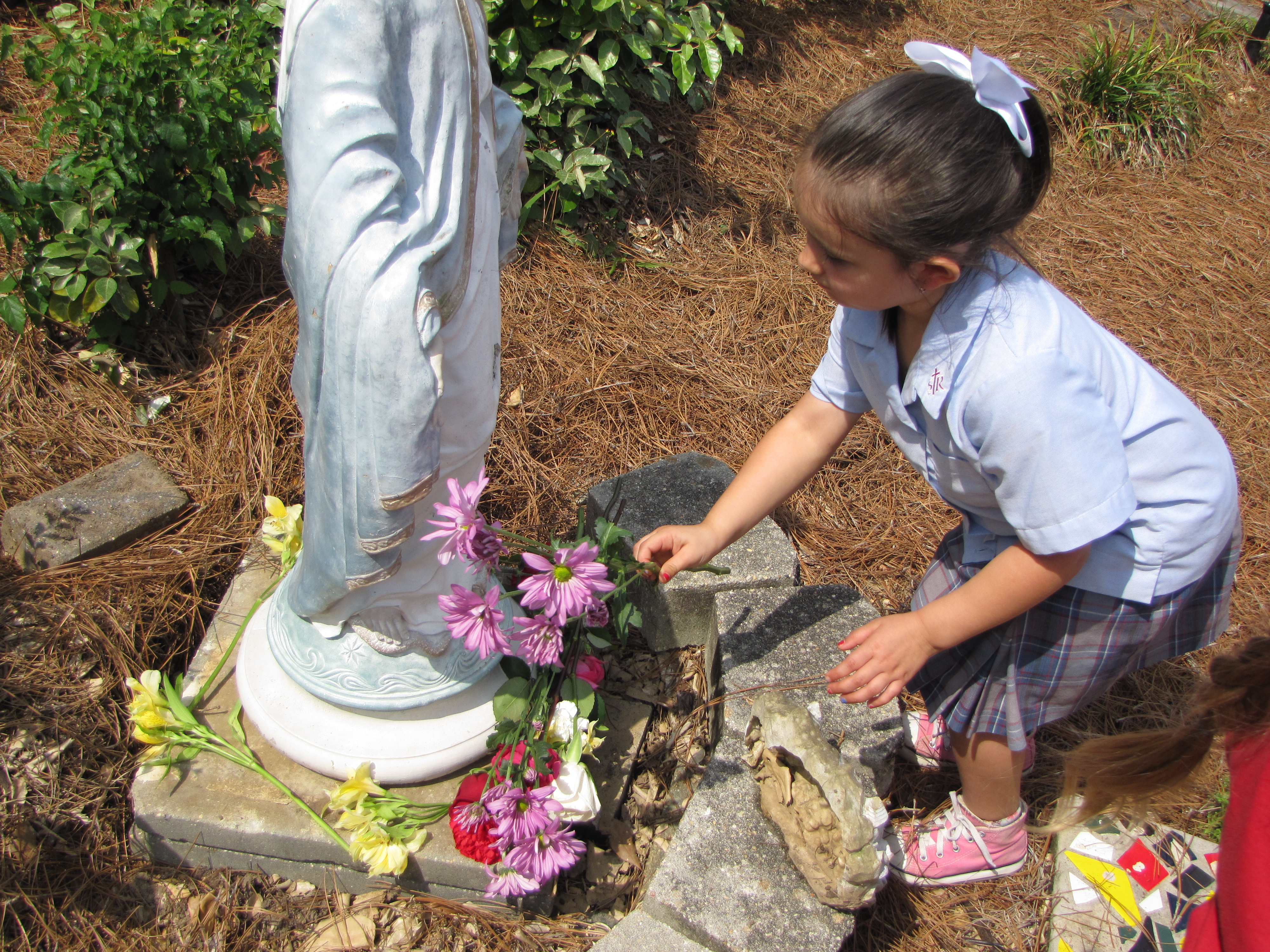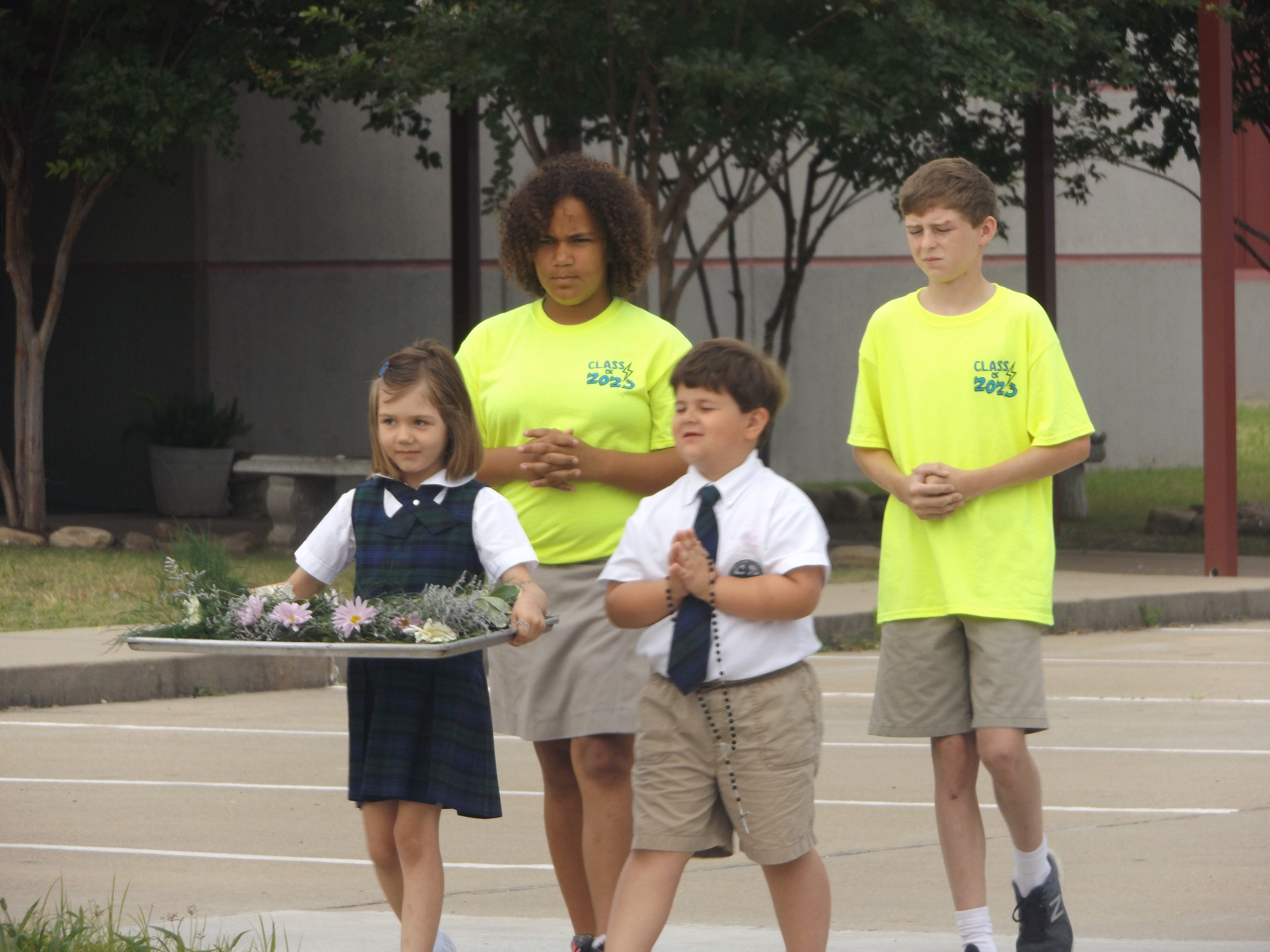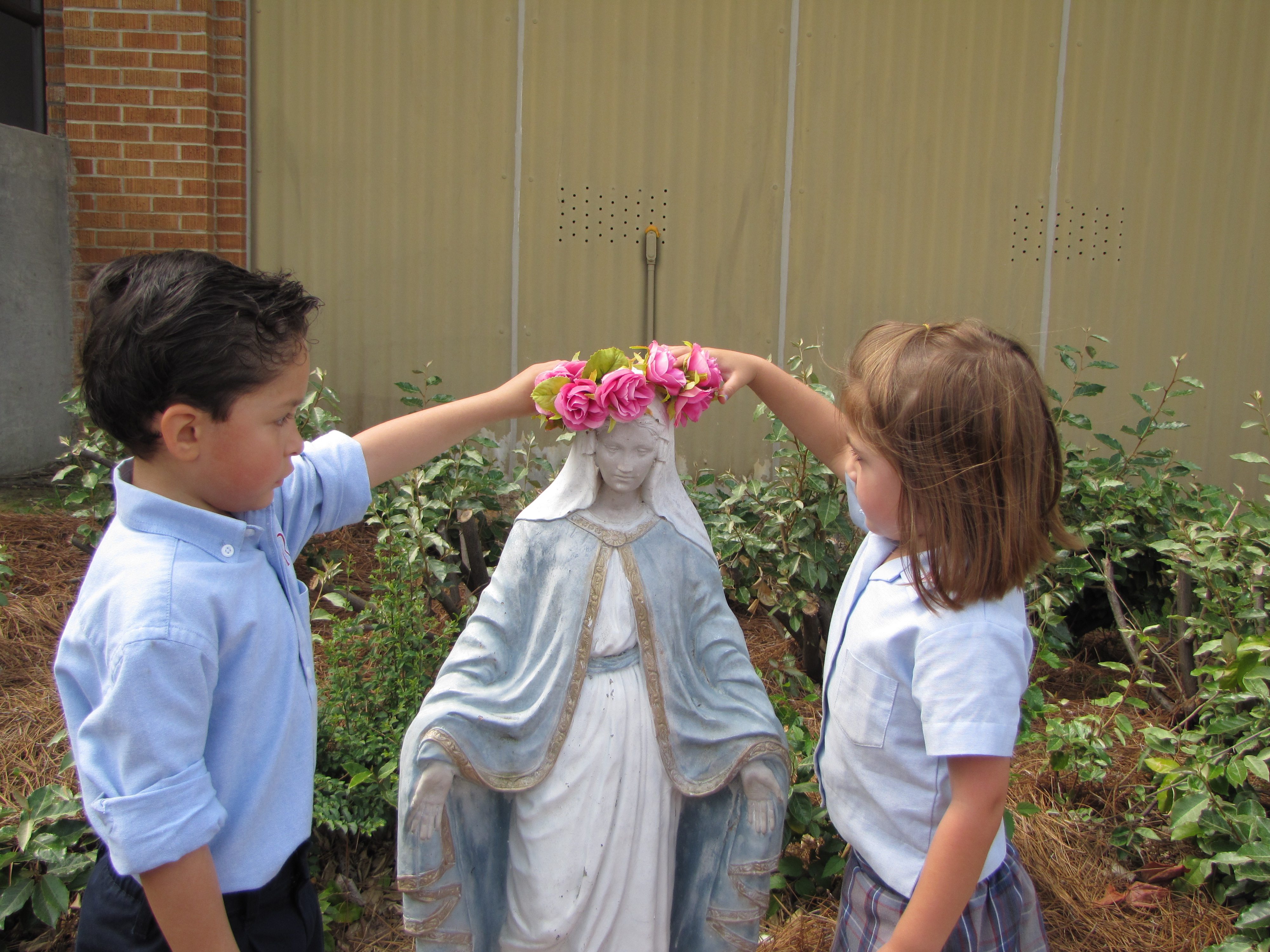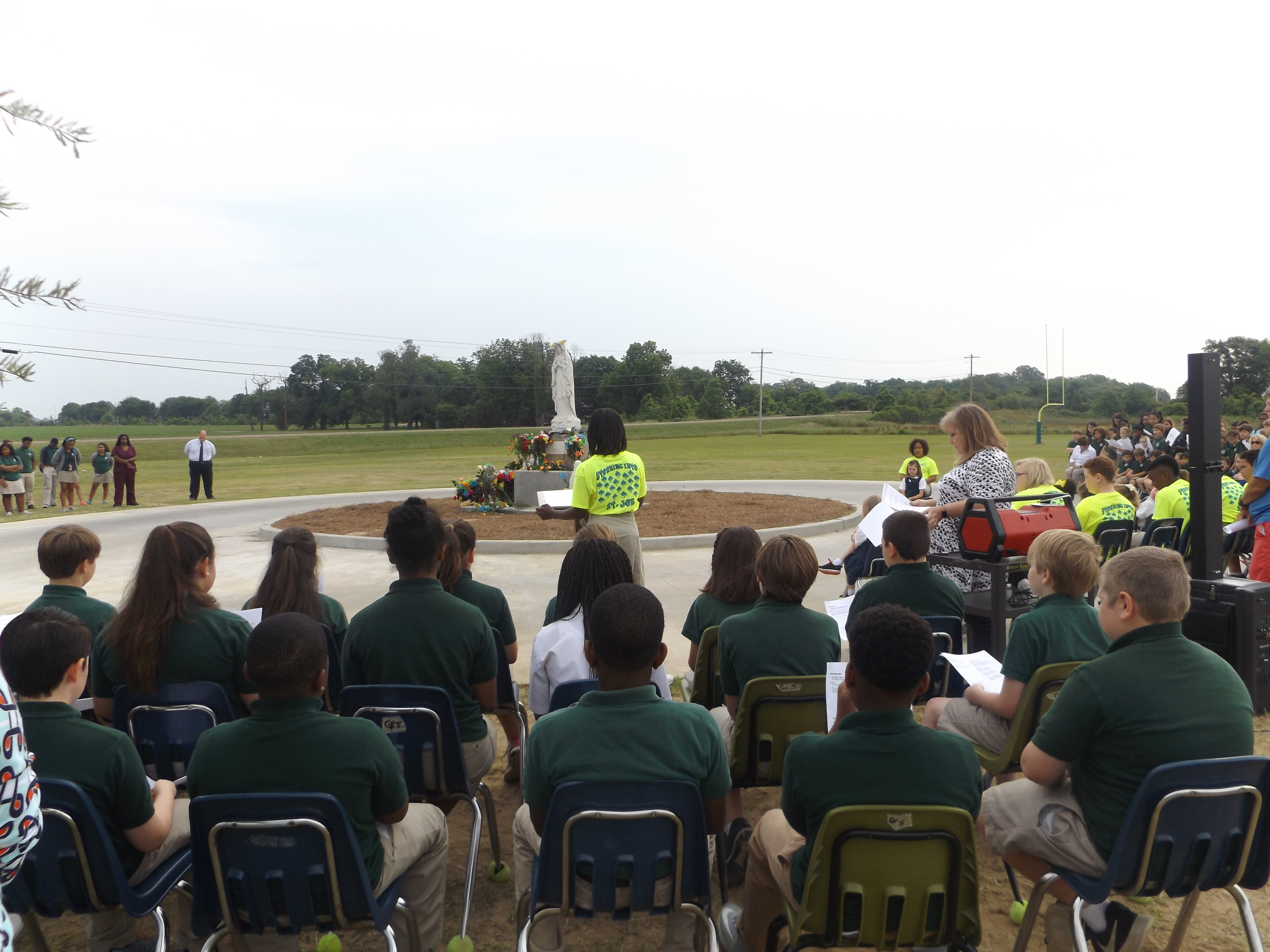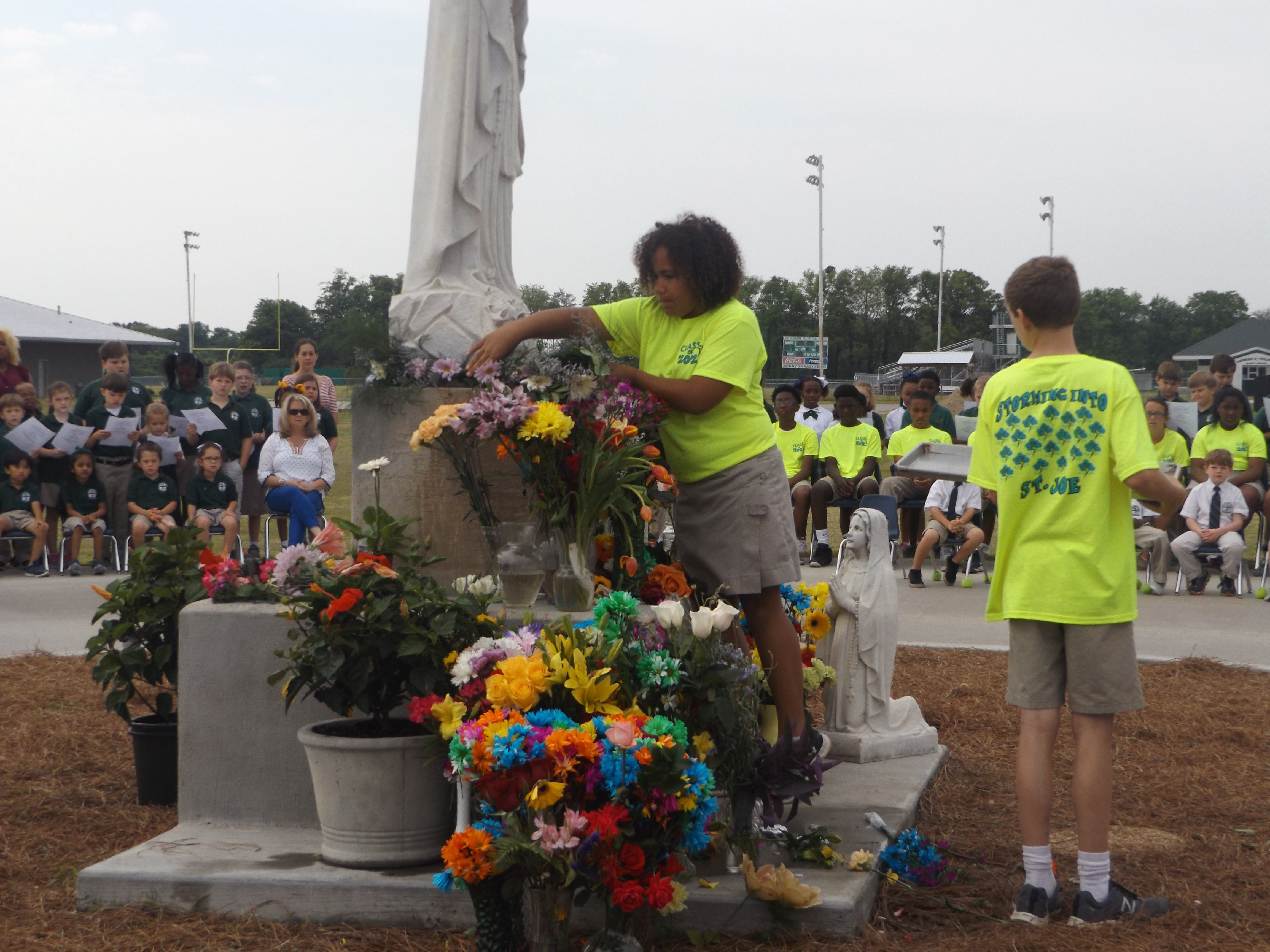 GREENVILLE – Students at St. Joseph School gathered in the outdoor prayer garden for the May Crowining. Senior Class President Allison Wise crowned Mary. (Photo by Missi Blackstock)