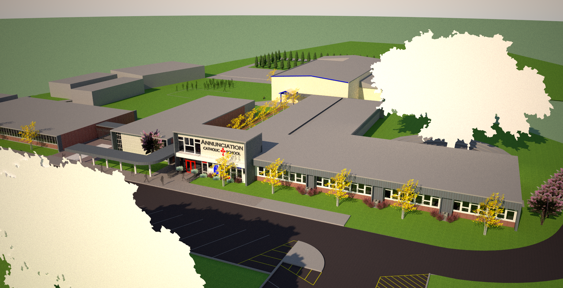 COLUMBUS – A rendering shows what the entrance to an expanded Annunciation School will look like. The school is raising money for a $3 million dollar expansion needed to keep up with rising enrollment. (rendering courtesy of Annunciation School)