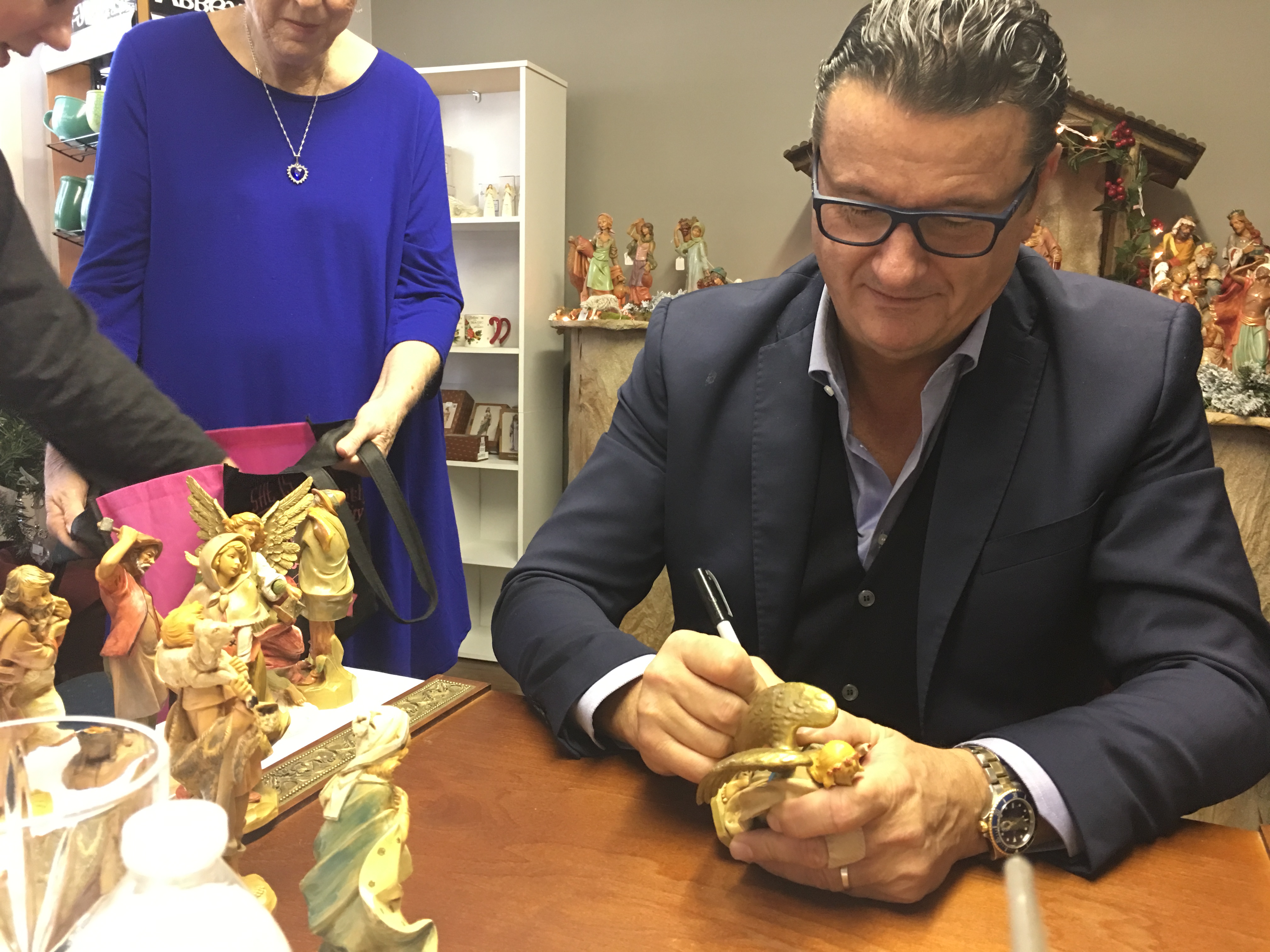 JACKSON – Emanuele Fontanini, a fourth-generation member of the family now famous for their detailed nativity sets, spent a couple of hours at the Carmelite monastary on Saturday, Dec. 1. The tour is part of Fontanini Nativity’s 110th anniversary. The artist signed figuries and visited with collectors. The Carmelites have carried the Fontanini collection in their gift shop for generations and even keep a registry for families who purchase a new figurine annually. (Photo by Tereza Ma)