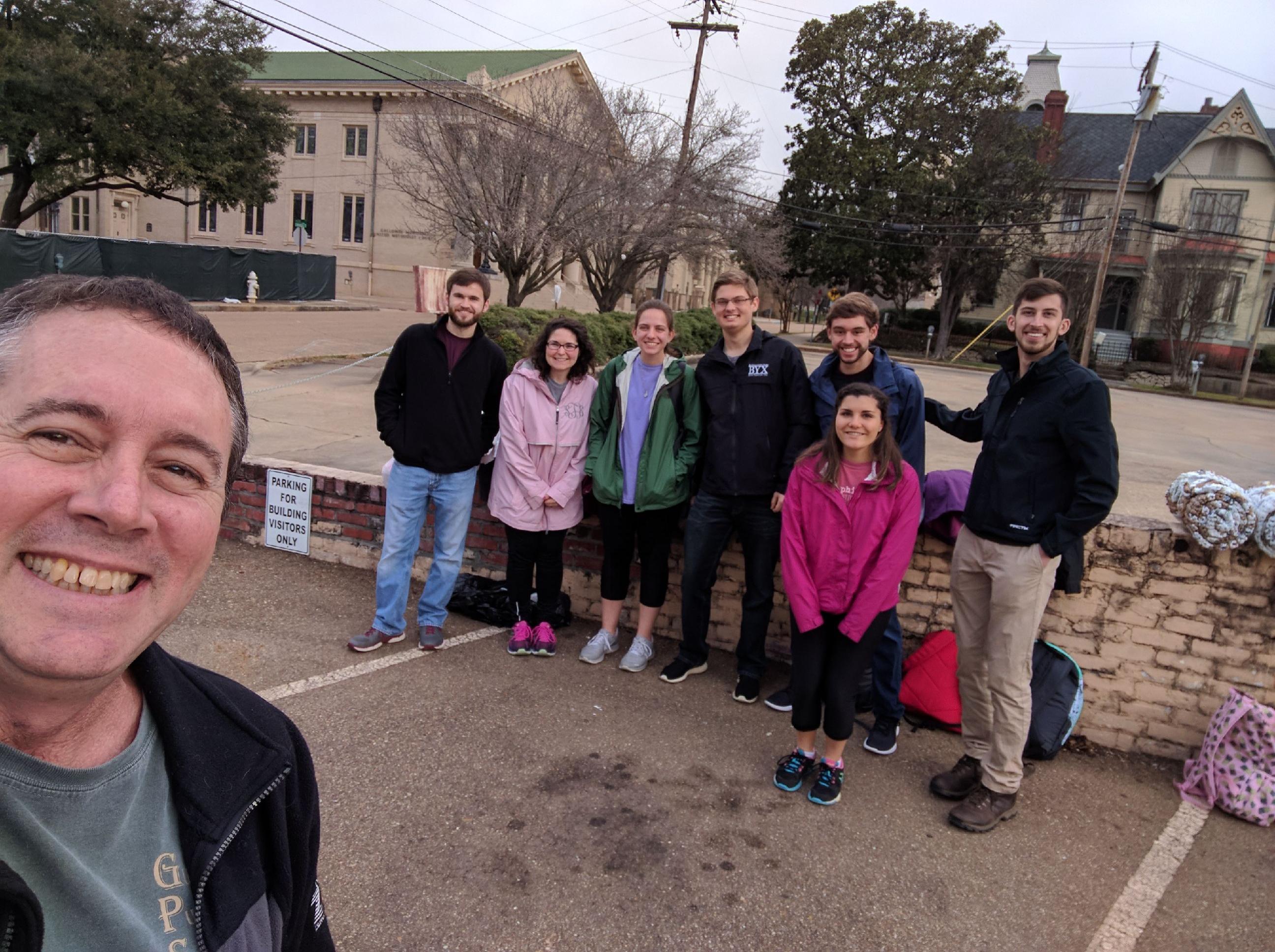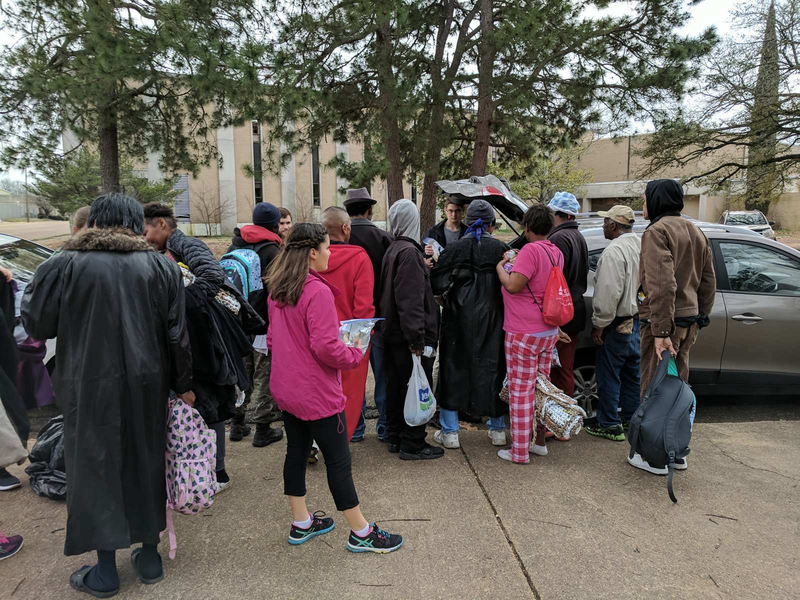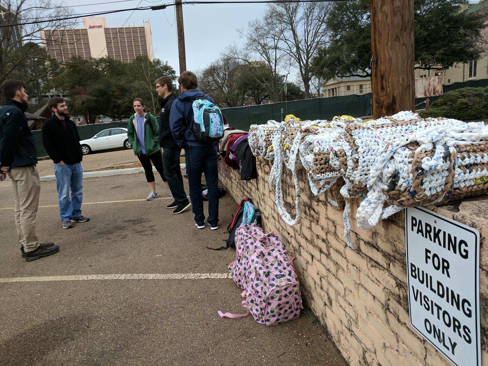 JACKSON – Volunteers from Mississippi State University’s Catholic Campus Ministry have started traveling to Mississippi’s capital city once a month to meet with and visit the homeless. “The project was inspired by our trip to the SEEK Conference in San Antonio, Tx in January 2017. There was a group at the conference named Christ in the City from Denver, Colorado,” explained Dawn McGinley, campus minister at Starkville St. Joseph Parish. “Their goal is to talk to the homeless – to connect with them and help them to see they have dignity. This inspired our group, so that is our goal. We bring relief bags which include basic necessities such as socks, lip balm, toothpaste, toothbrushes, soap, shampoo, underwear, tissues, etc.,” she added.