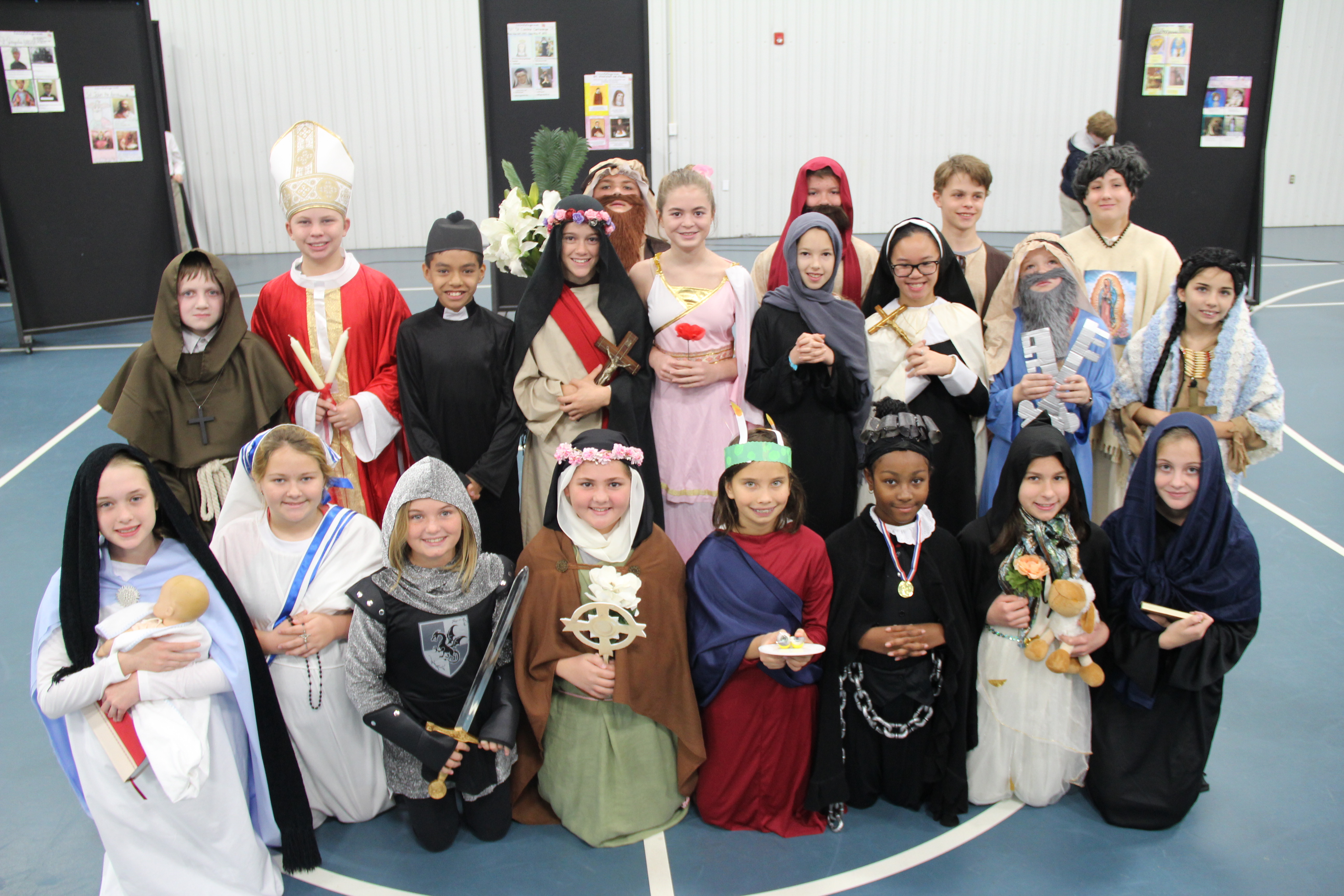 COLUMBUS – Annunciation sixth-grade students presented the Hall of Saints on Friday, November 2. Each student researched a saint for several months and then portrayed that saint, complete with costumes and props, while telling interesting facts about them to the younger students. (Photo by Katie Fenstermacher)