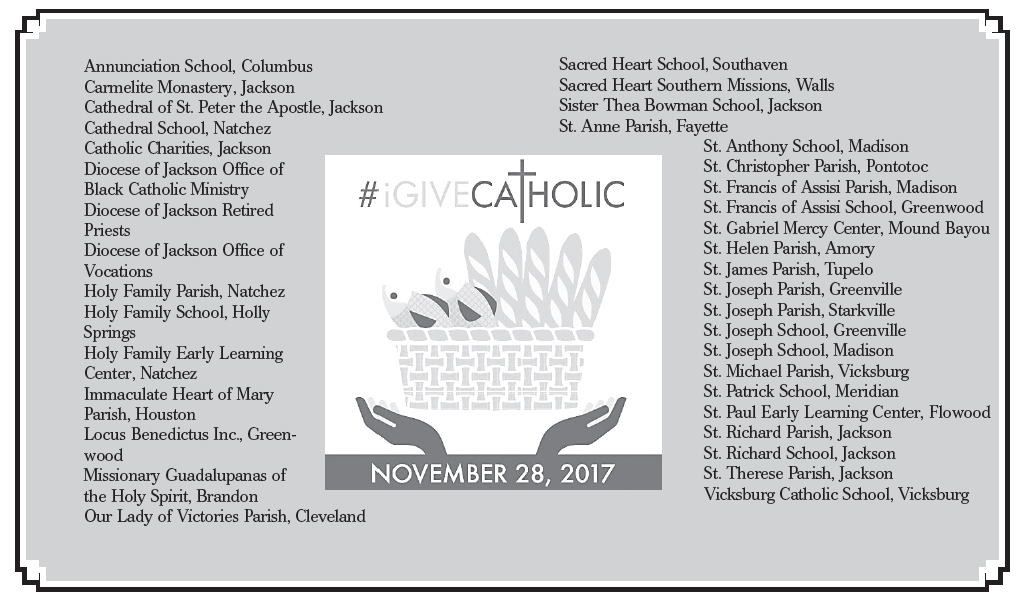 JACKSON – For the third year in a row, the Catholic Diocese of Jackson is joining several dioceses around the country to host #iGiveCatholic on #GivingTuesday, the week after Thanksgiving. Participating parishes, schools, and Catholic non-profit organizations will have the opportunity to raise funds online for their own local needs. The Catholic Foundation has funded this program again this year by paying fees so local participants can concentrate on creative ways to appeal to donors.