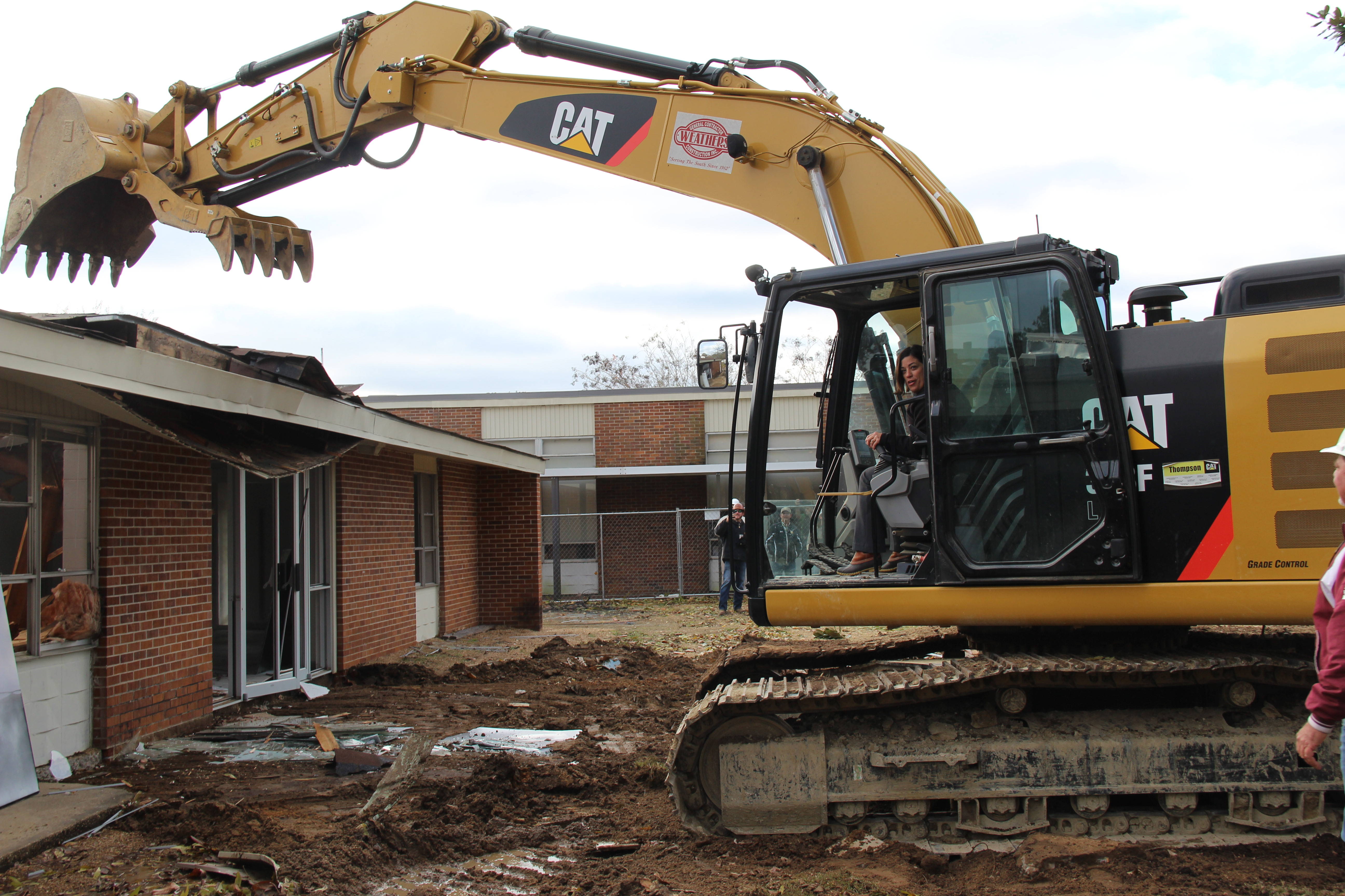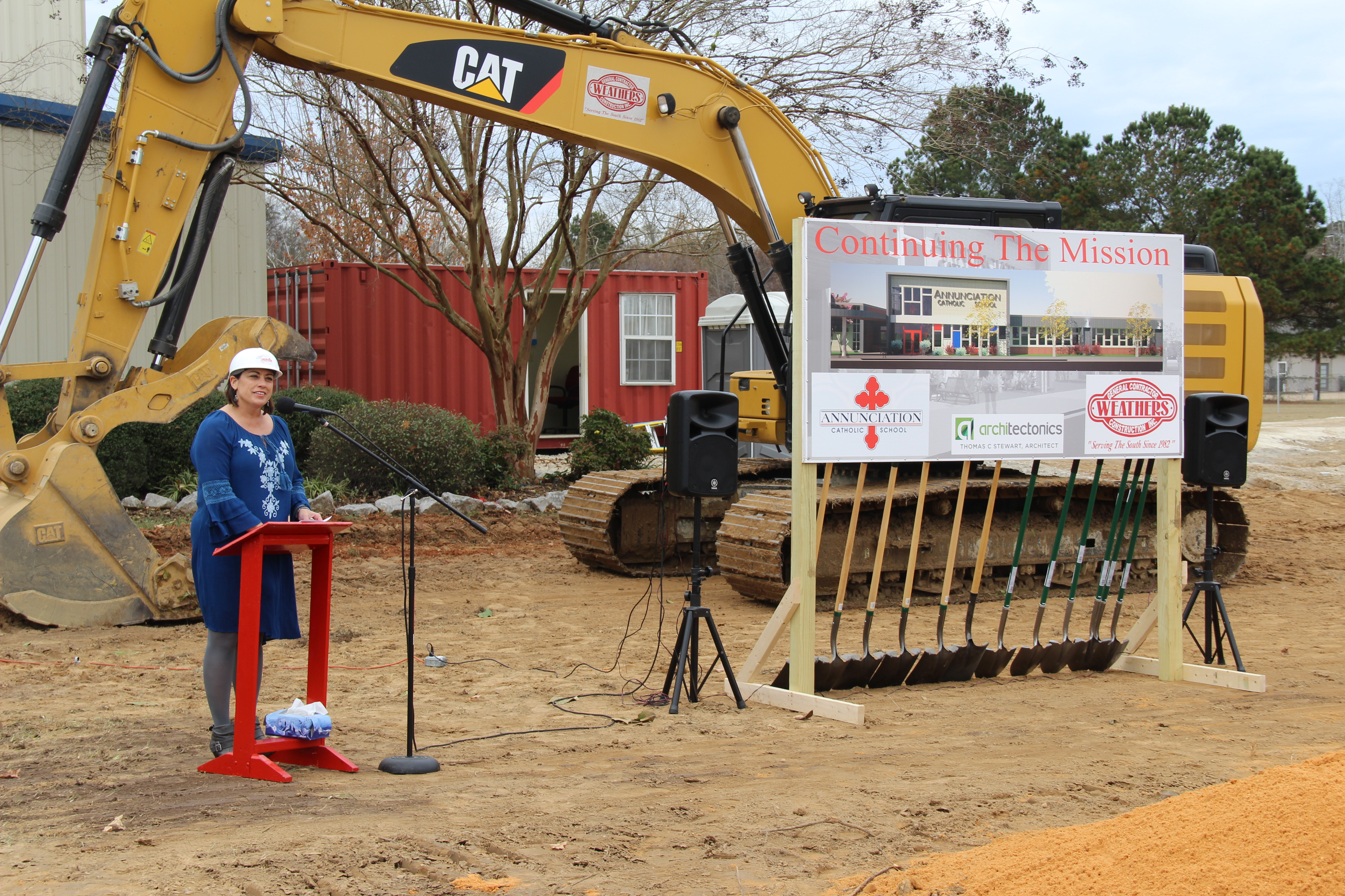 Representatives from each committee that worked on getting the school to this point joined Bishop Joseph Kopacz to “break ground” on this exciting new venture. The ceremony included alumni, parent, student and faculty speakers as well as a ceremonial turning of the dirt on the worksite. Earlier in the week, principal Joni House and Father Jeffery Waldrep got behind the controls of a backhoe to smash the front wall of the old building. Once they took a swing or two, construction crews took over to clear the lot for real work to begin.