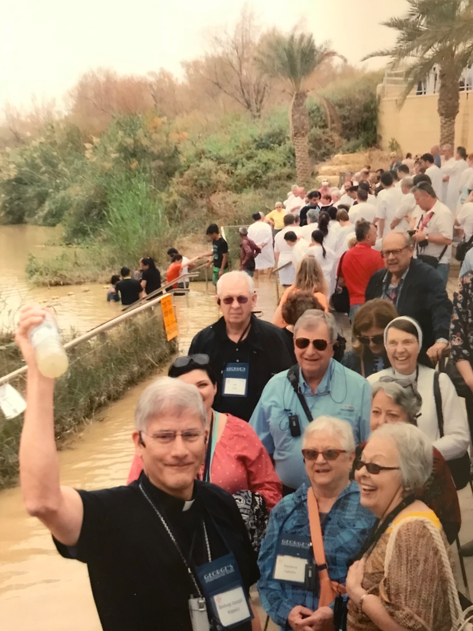On we traveled to Capernaum, home of Jesus during his ministry. Here Jesus met his first disciples, all fishermen who worked on the Sea of Galilee and where Jesus performed many miracles including the healing of Peter’s mother-in-law. After visiting the Synagogue and St. Peter’s house, the drive took us to the Church of the Primacy where Jesus appeared to the Apostles after His Resurrection and Tabgha, the site of the miracle of the multiplication of the loaves and the fishes. Leaving Galilee, our pilgrimage took us through the Judean wilderness to Jerusalem to the site on the Jordan River where we celebrated the RENEWAL of our Baptismal promises.