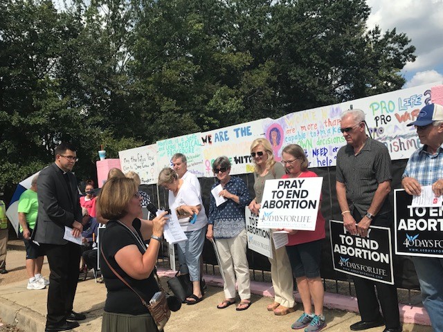 JACKSON – Deacon Nick Adam, at left, waits to speak at the kickoff to 40 Days for Life in Jackson on Wednesday, Sept. 27, at noon outside the abortion clinic in Fondren. 40 Days for Life is a national campaign of prayer, fasting and advocacy focused on an end to abortion. (Photo by Suzan Cox)