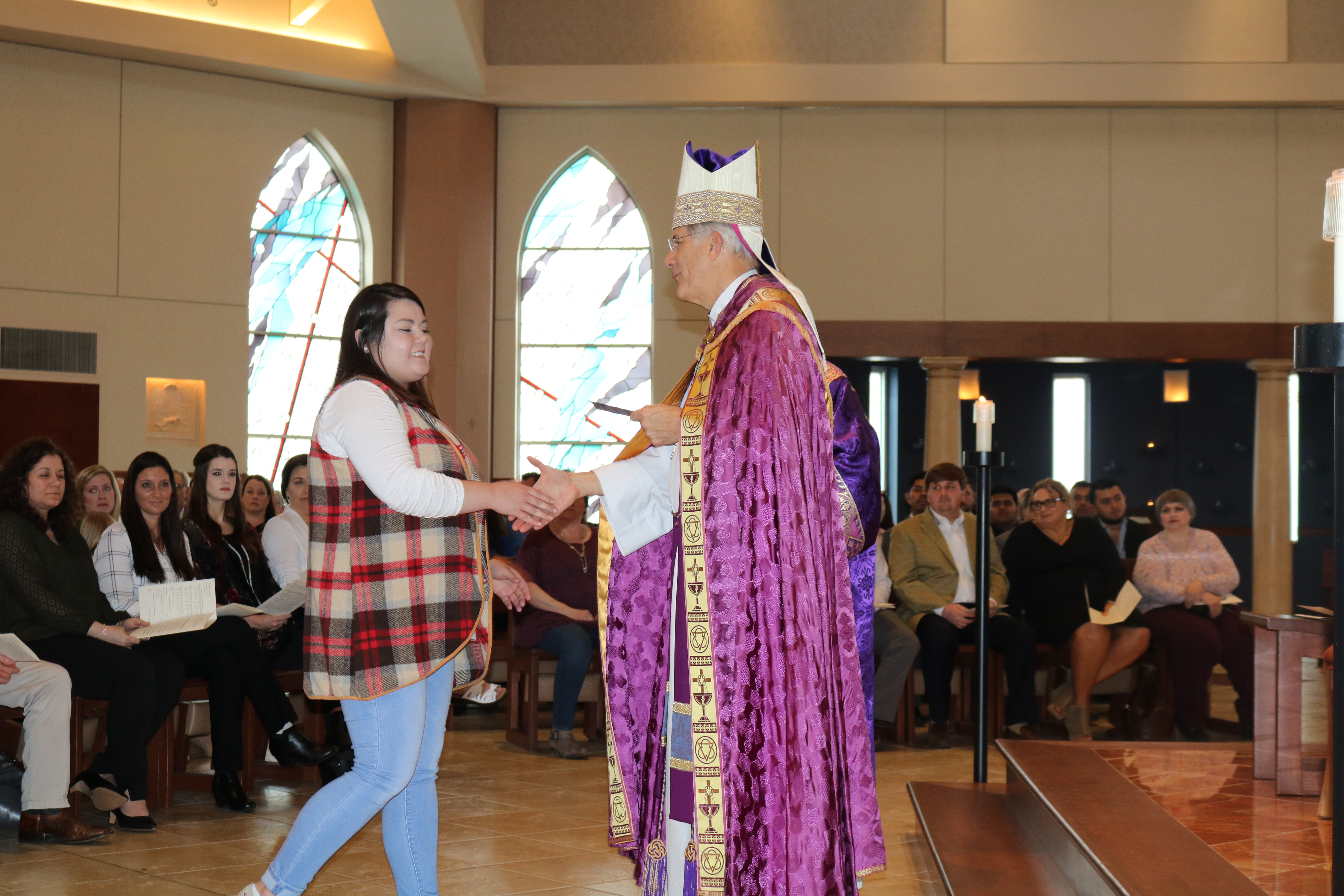 Mary Woodward, chancellor, presented a book with their names to the bishop before all the catechumens and candidates received a blessing and a Pastoral Priorities prayer card from Bishop Kopacz.