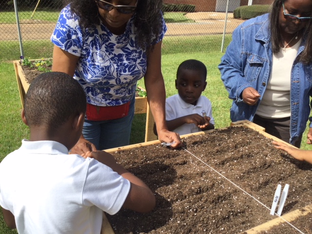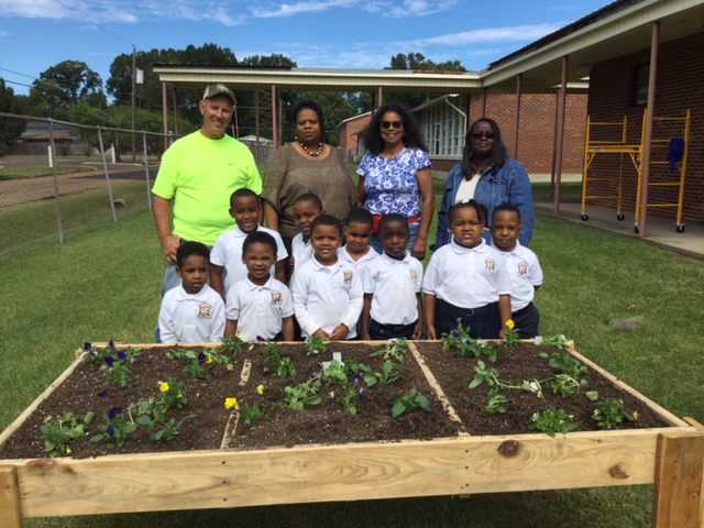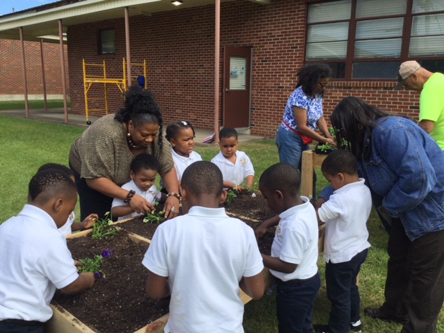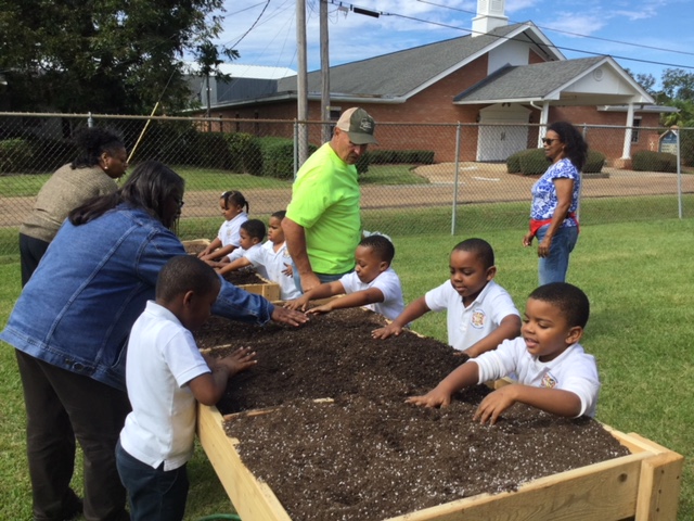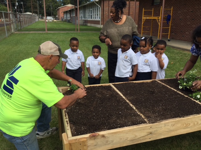 JACKSON – Master Gardeners John Malanchak and Valerie Anderson teach Sister Thea Pre-K students a science lesson on plants. Malanchak provided two plant boxes: one for the students to plant violets and pansies and the other to plant their vegetables: kale, spinach, onions and radishes. (Photos by Shae Robinson)